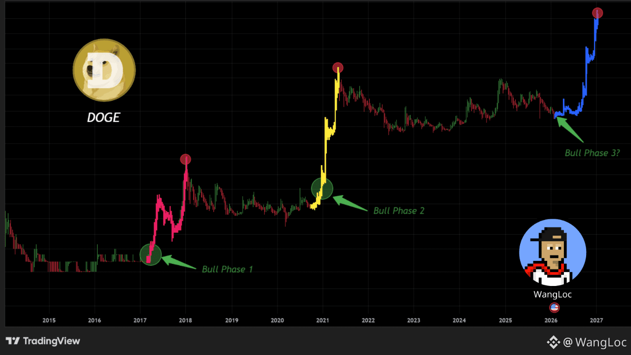 Historically, $DOGE tends to underperform for extended periods, building long bases while sentiment fades.