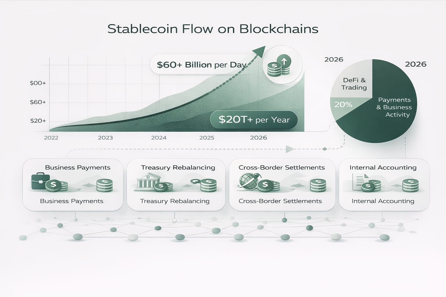In 2026, on-chain data shows stablecoins consistently settling $60+ billion per day, even outside of major market events. That translates into multiple trillions of dollars per year moving through public blockchains. What’s changed recently isn’t just volume. It’s purpose. More of these transfers are tied to business payments, treasury rebalancing, cross-border settlements, and internal accounting, not speculative trading.