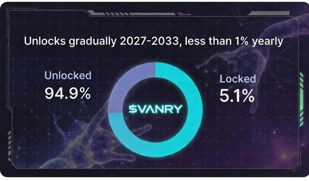 That means 94.9 percent of the supply is unlocked, with only 5.1 percent still locked for gradual release between 2027 and 2033. The unlocks are small, less than 1 percent each year, which tells me the project is not hiding supply mechanics or planning sudden shocks. Unlike projects that face heavy unlock cliffs and sudden dilution, Vanar's Vanarchain schedule spreads releases thinly over years.
