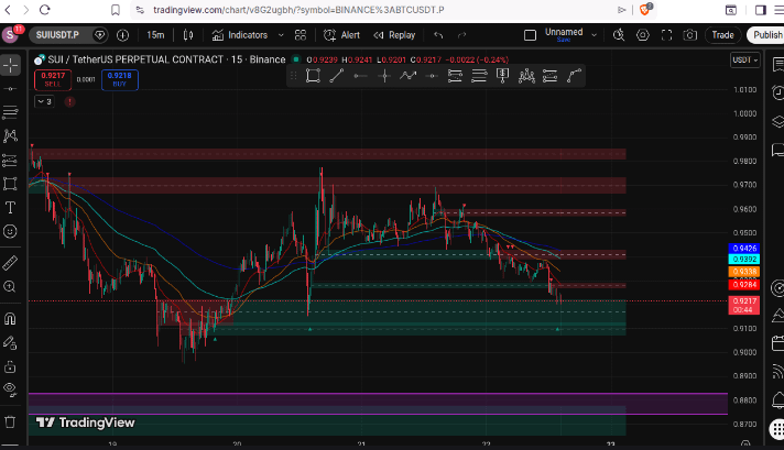 $SUI is currently trading around $0.9217, sitting exactly at a critical support confluence (0.9200–0.9250) after rejecting from the 0.98 – 0.99 major resistance zone.