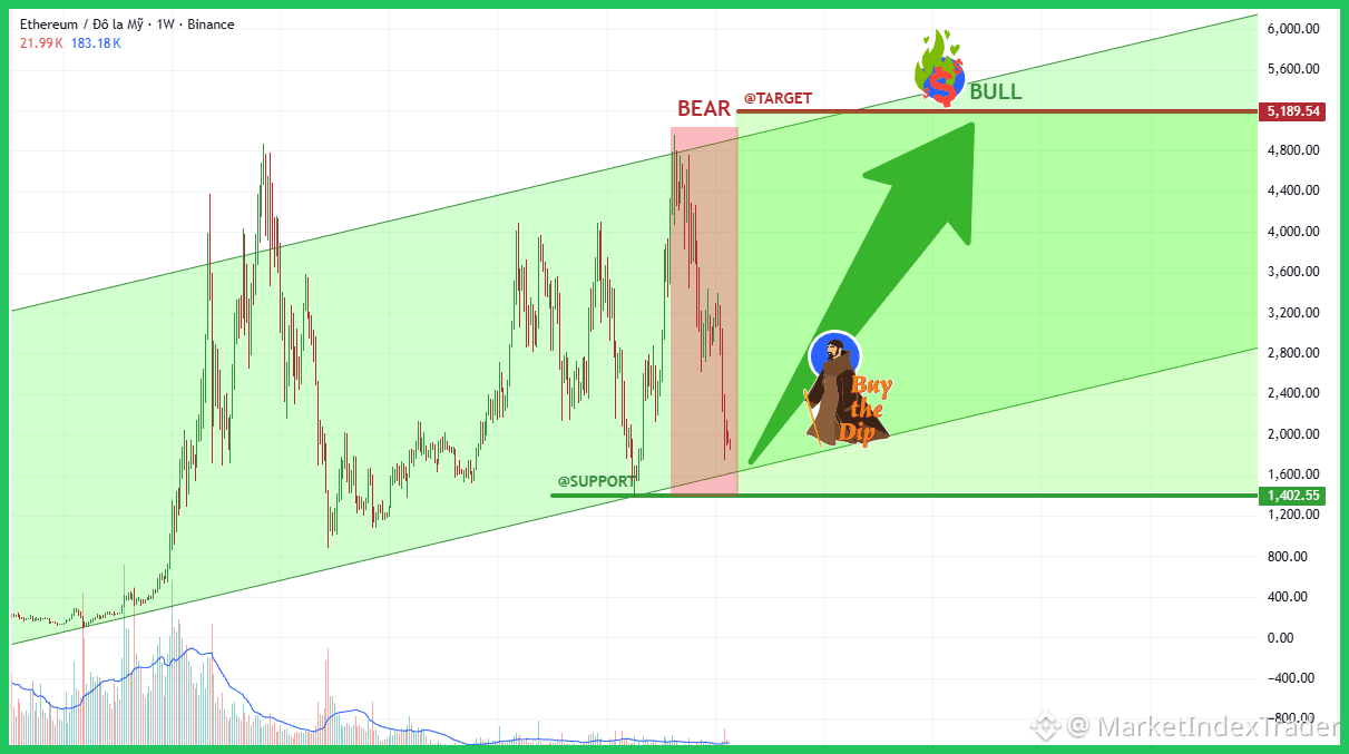 Alright team, let's break down this juicy $ETH chart and see what's cooking. The weekly timeframe reveals Ethereum has been trading within a well-defined ascending channel for quite some time. Recently, we saw a clear retest and strong bounce from the lower boundary of this channel, right around the $1,400 - $1,600 support zone. This 'Buy the Dip' signal is looking strong, pushing price back towards the channel's midline.