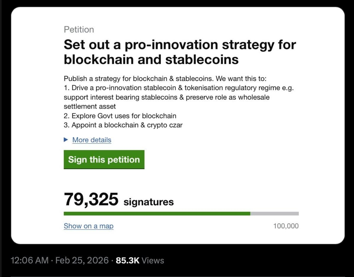 A petition backed by industry advocates is calling on U.K. policymakers to publish a comprehensive strategy for blockchain and stablecoins. The proposal includes support for interest-bearing stablecoins, preserving their role in wholesale settlement, exploring government use cases for blockchain technology and appointing a dedicated crypto lead.
