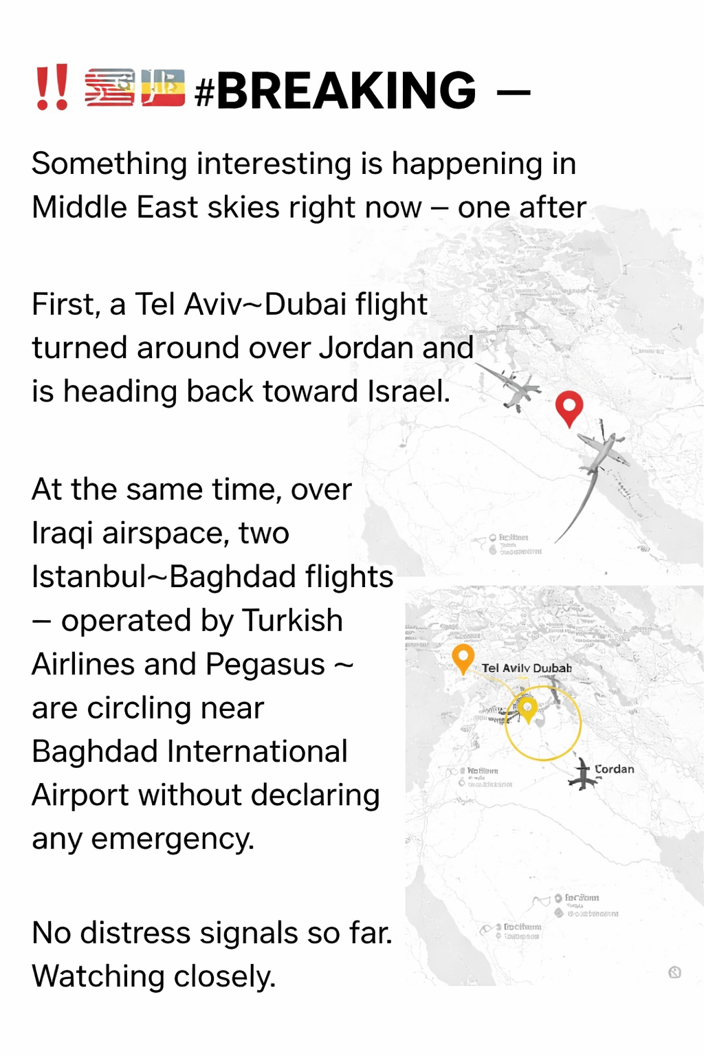 At the same time, over Iraqi airspace, two Istanbul–Baghdad flights — operated by Turkish Airlines and Pegasus — are circling near Baghdad International Airport without declaring any emergency.