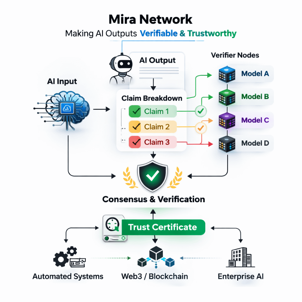 Mira Network focuses exactly on this issue. It does not claim to make AI perfect. Instead, it aims to make AI outputs auditable. The approach is simple but delicate: break every answer into small, verifiable claims, then pay independent verifiers to confirm or reject those claims.