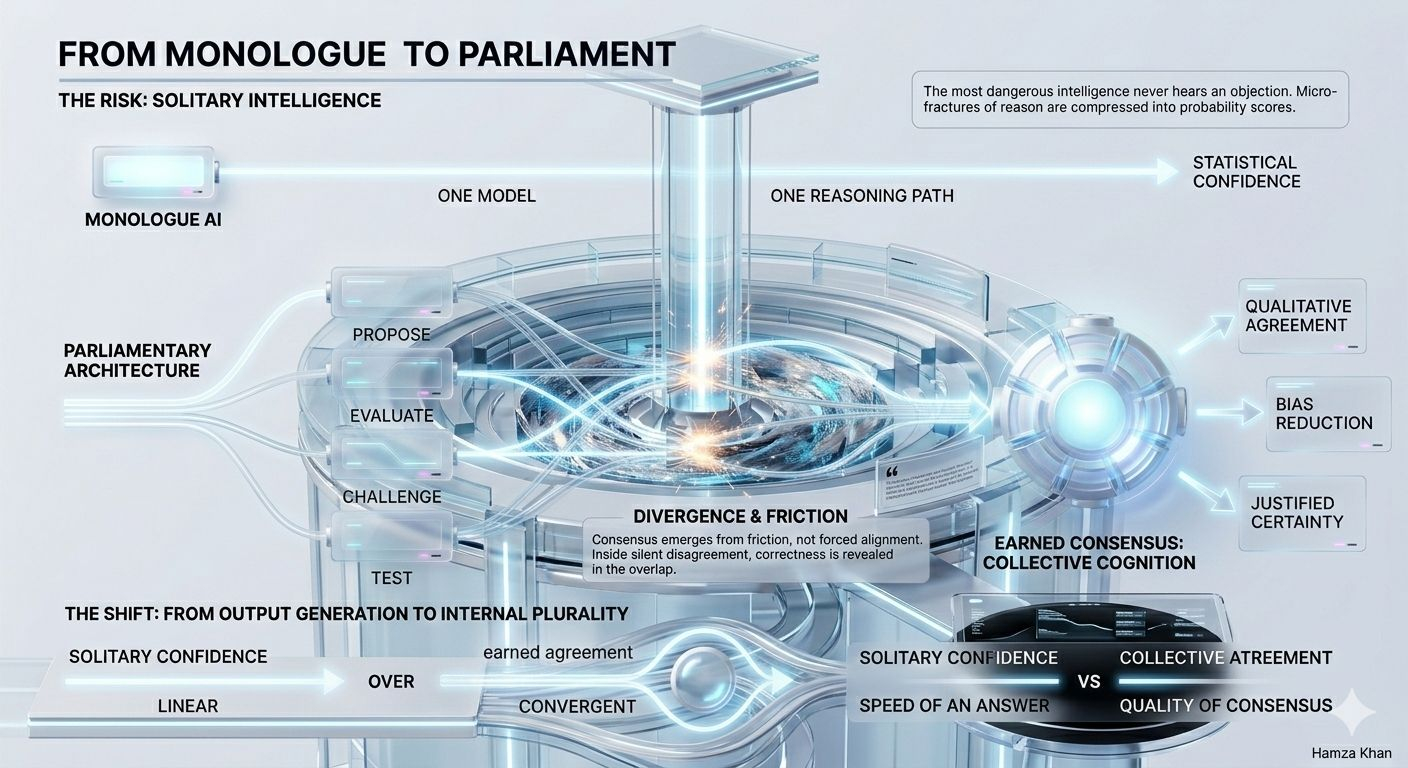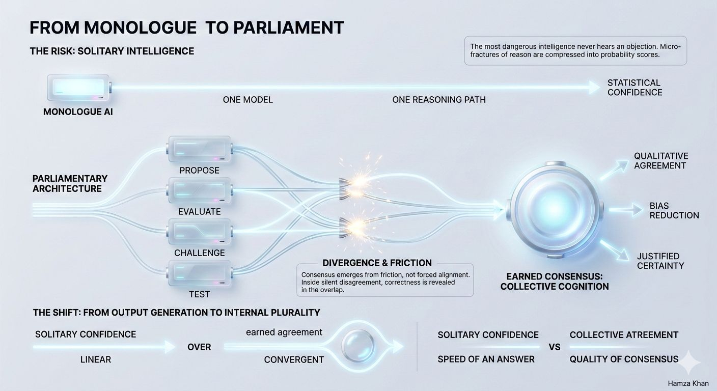 Traditional AI operates like a monologue. One model. One reasoning path. One conclusion delivered with statistical confidence. However advanced the architecture, however vast the training data, it remains structurally solitary. And solitary systems don’t debate — they predict.
