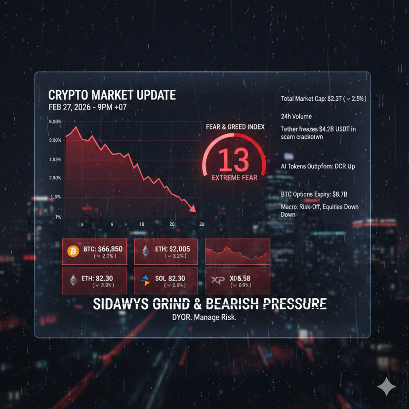 The crypto market tonight (February 27, 2026, around 9 PM +07) is showing continued consolidation with a bearish tilt, mostly red across majors. Total market cap sits around $2.3T, down roughly 2–2.5% in the last 24 hours (based on sources like CoinDesk and RTTNews). 24h trading volume has dipped to ~$100–110B.