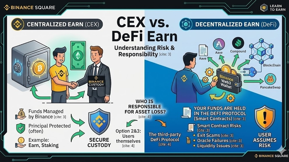 Many users confuse Centralized Exchange (CEX) products (like Binance Earn) with the Decentralized Finance (DeFi) options accessible through the Binance Web3 Wallet. Today, we break down the critical differences based on key risk management principles.