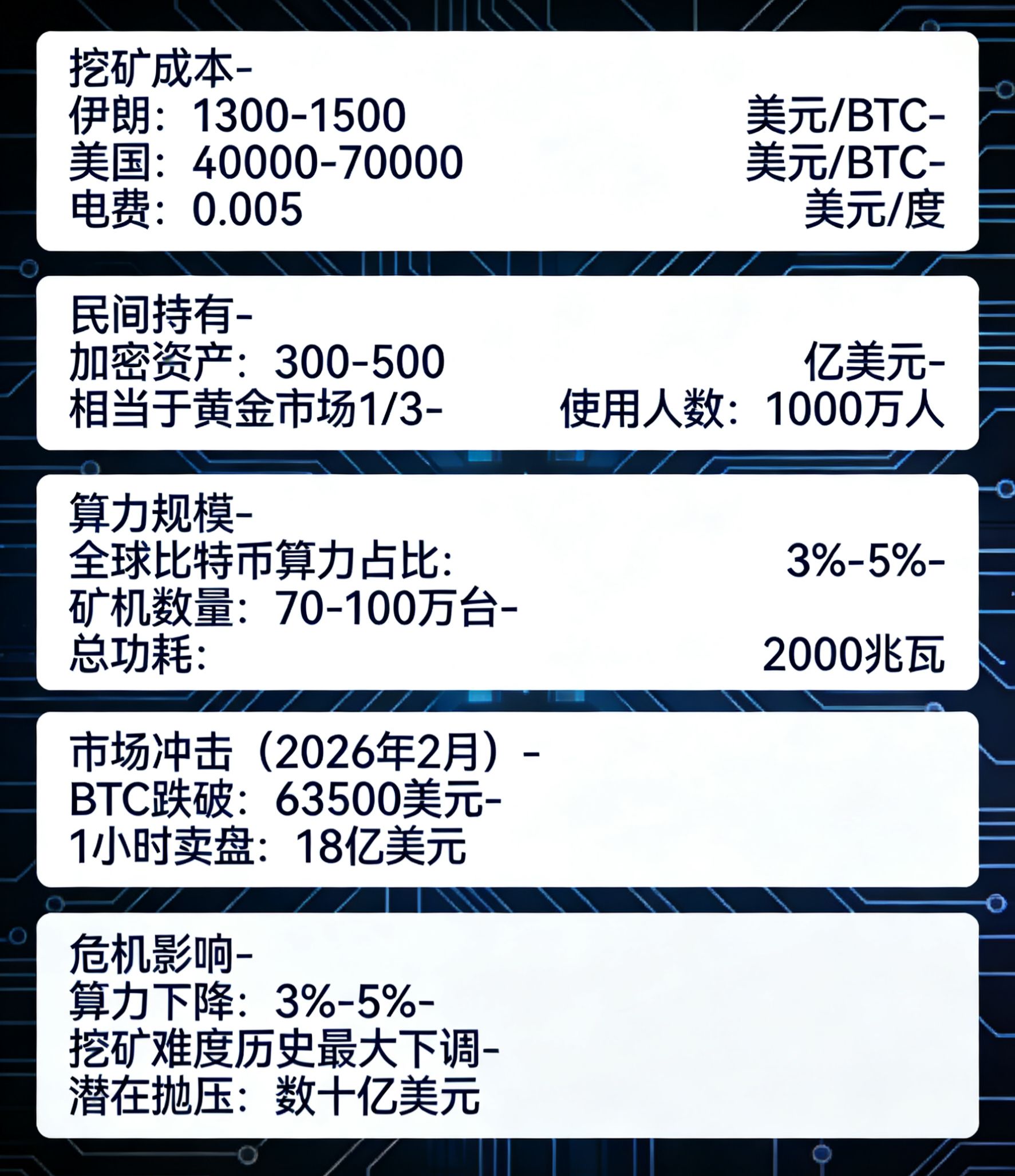 2026年2月底的军事打击已经让市场感受到寒意。消息传出后,比特币一度跌破63500美元,一小时内卖盘量激增至约18亿美元——虽然这主要是杠杆资金被清理,而非矿工抛售,但真正的风险在于供给端。