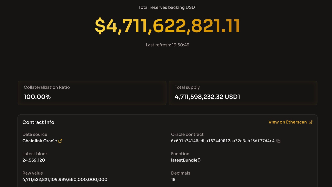 而 USD1 现在的逻辑非常硬核:它通过 Chainlink 预言机,直接从 BitGo 实时拉取储备数据,验证后自动写入链上。