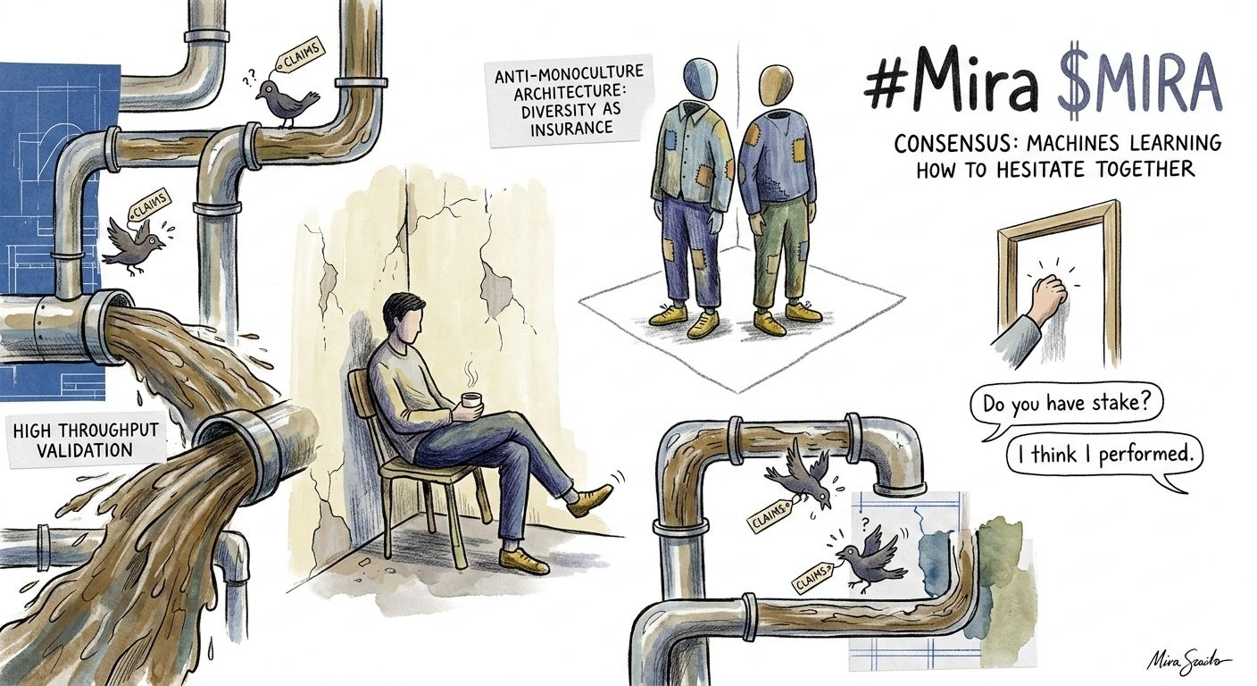 Like someone sitting in a small room with a cracked wall where the paint is peeling slightly near the corner and there is a chair that makes a noise when you move because one leg is shorter. That kind of room. Not important room. Just existing room. And inside that room I imagine the behavior of Mira Network like it is breathing slowly, checking things before speaking.