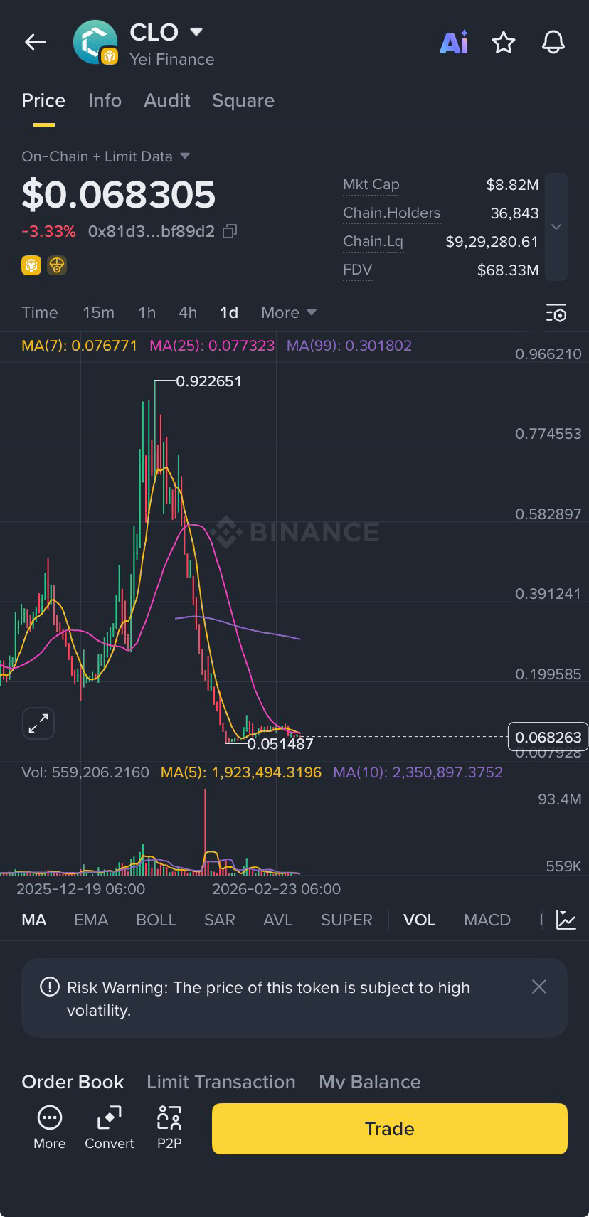 The $CLO chart shows a significant correction from its local high of $0.92, currently finding solid support around the $0.05 - $0.06 range. After a period of intense volatility, the price is entering a tight consolidation phase.