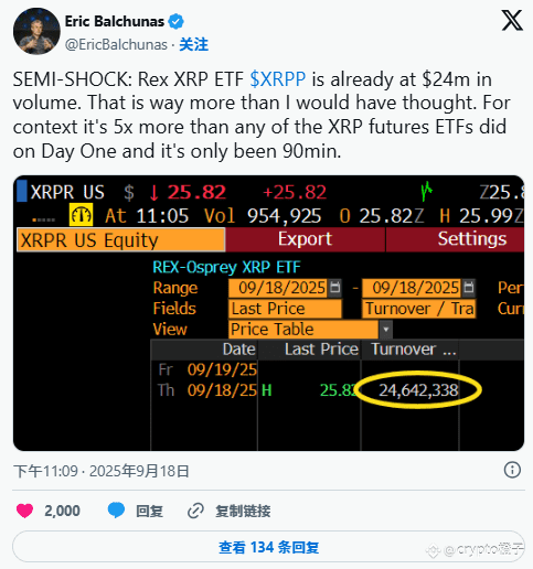 Rex XRP ETF(代码:$XRPP)交易量已达2,400 万美元。这远超我的预期。对比来看,这是XRP 期货ETF 首日交易量的五倍,而现在才过了90 分钟。