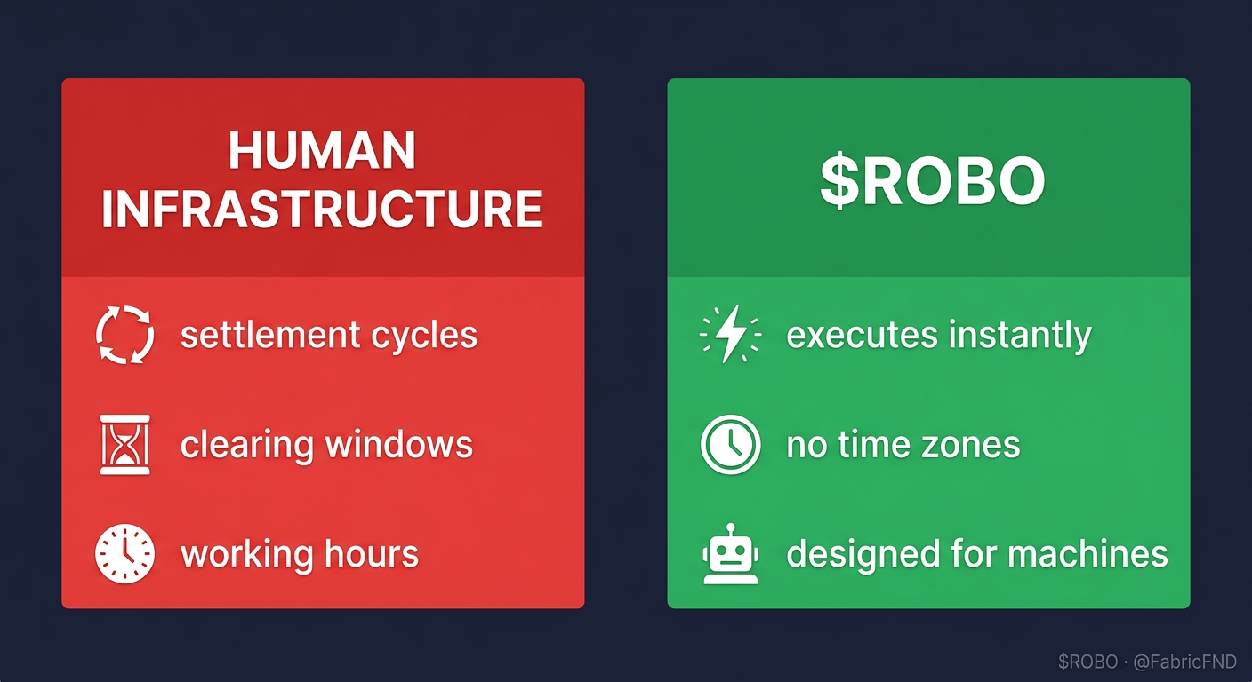 Its not trying to plug robots into existing financial infrastructure. Its building a completely separate layer designed from scratch for machine participation. Smart contracts that execute the moment work is cryptographically verified. Settlement that doesnt care what time zone the counterparty is in or what day of the week it is. A payment system where robots humans and AI agents are treated identically because the system was never built around the assumption that only humans participate.
