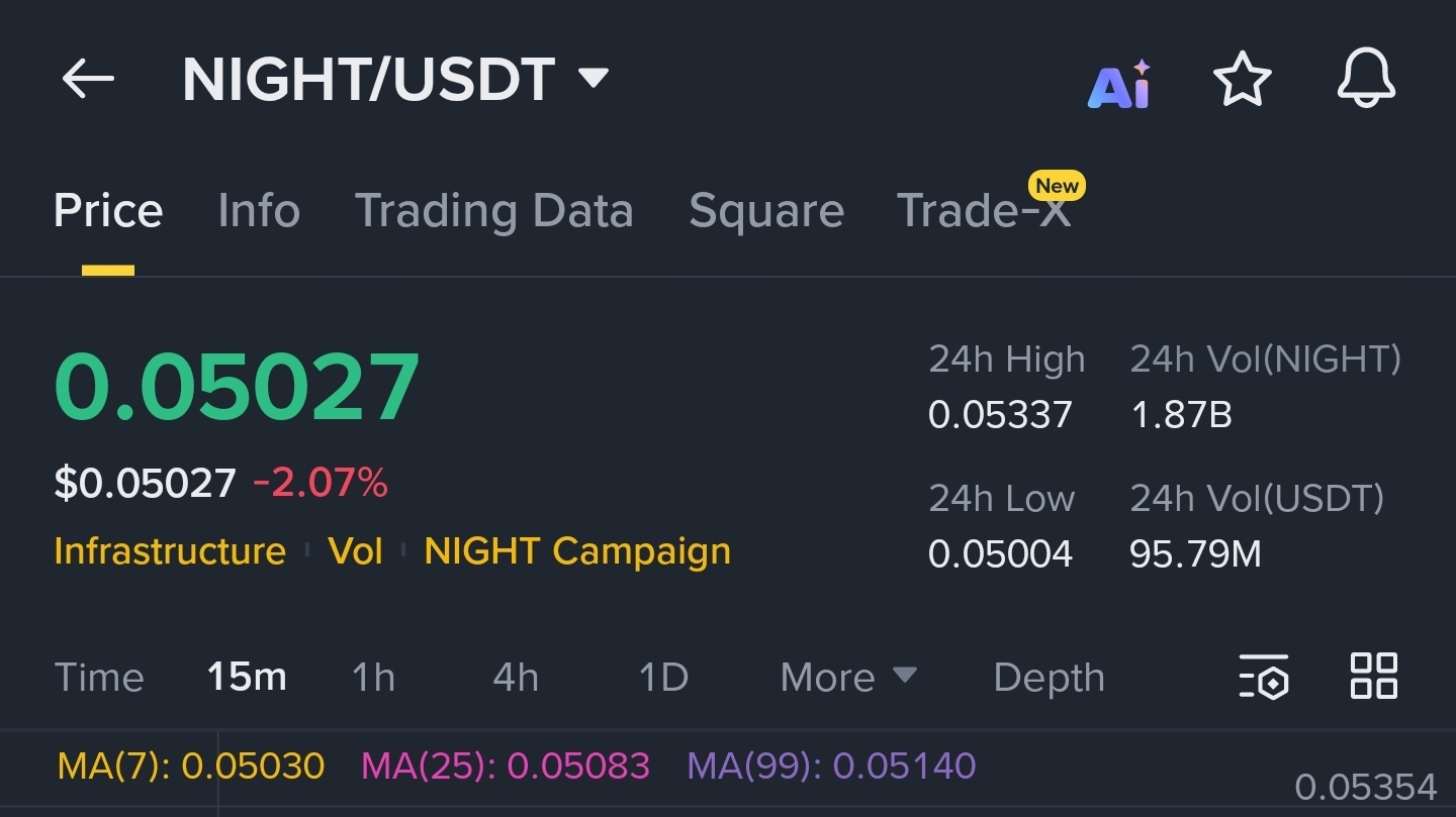 Now look at the bigger picture. $NIGHT is still holding above $0.05 after multiple tests. MA99 is at $0.05140, MA25 at $0.05083, MA7 at $0.05030. Everything overhead is resistance to reclaim, yes. But the floor is holding.