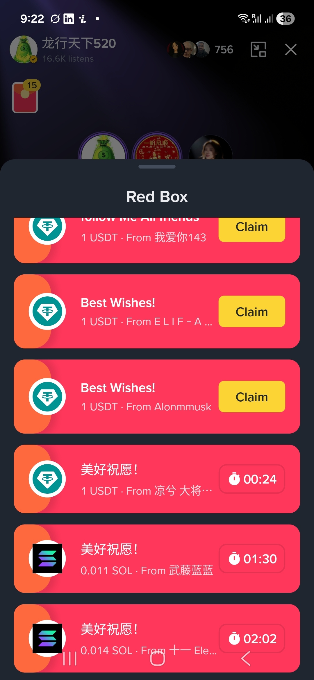 - Some SOL drops (e.g. 0.0111 SOL or 0.014 SOL) were real – they come straight from the host's wallet and if you're quick enough, you can claim them. But in rooms with 16K+ listeners, they get claimed in seconds.