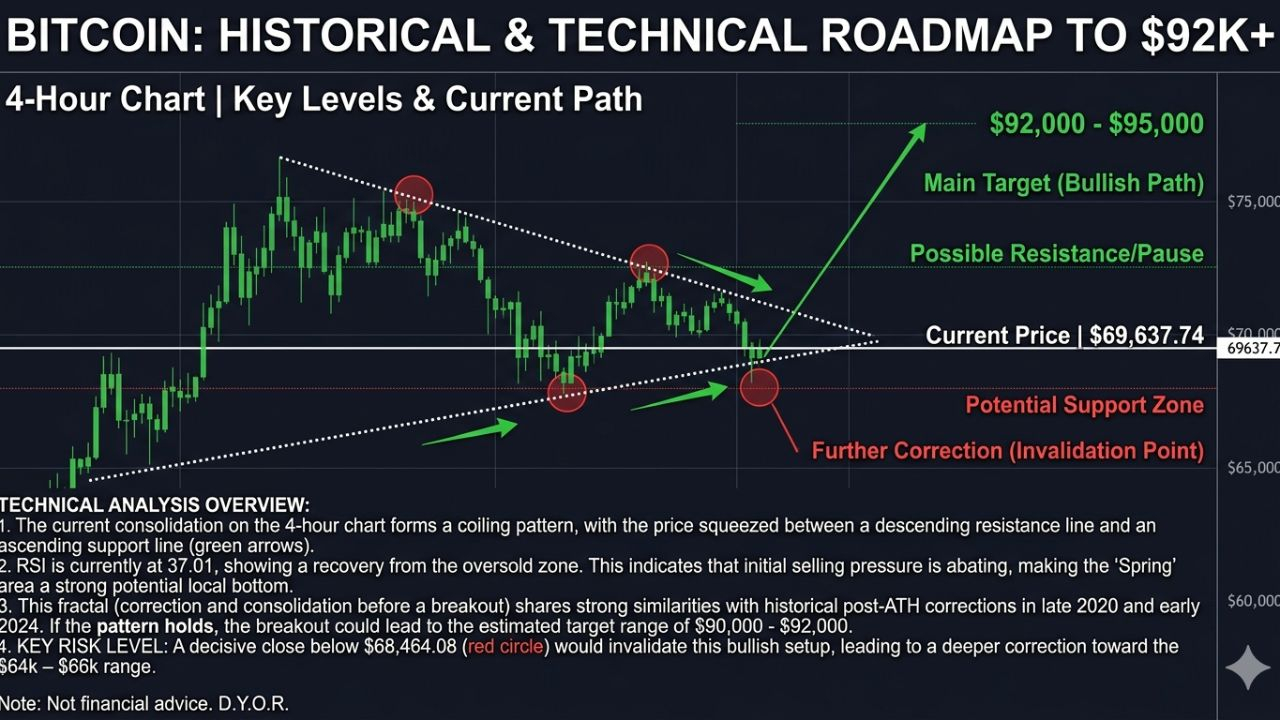 Bitcoin is currently navigating a critical consolidation phase on the 4-hour chart, trading around $69,637. The technical structure suggests a "coiling" effect, where price action is being squeezed between a rising support line and a heavy overhead resistance.