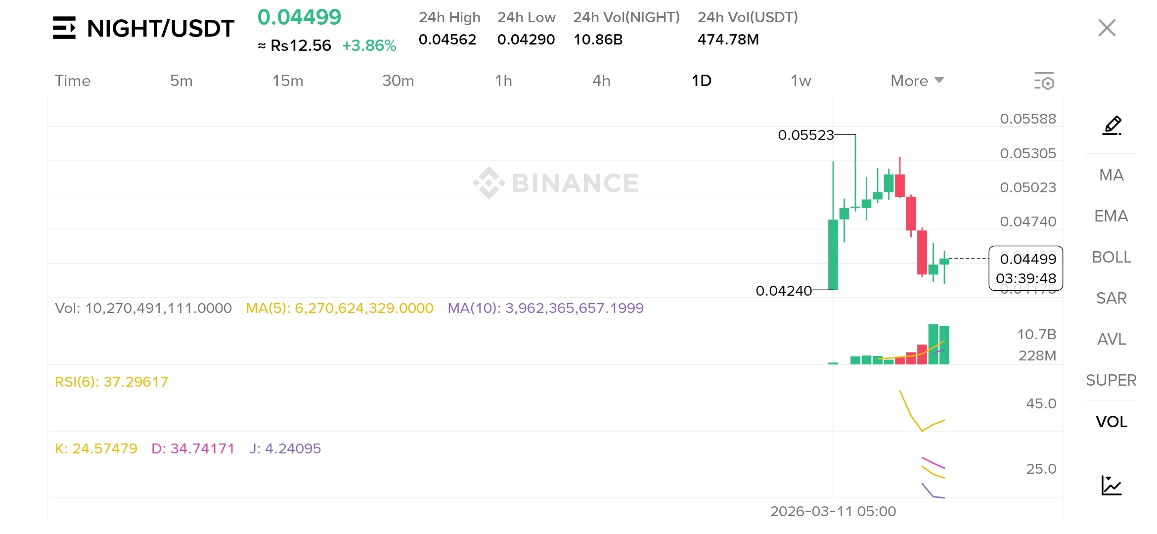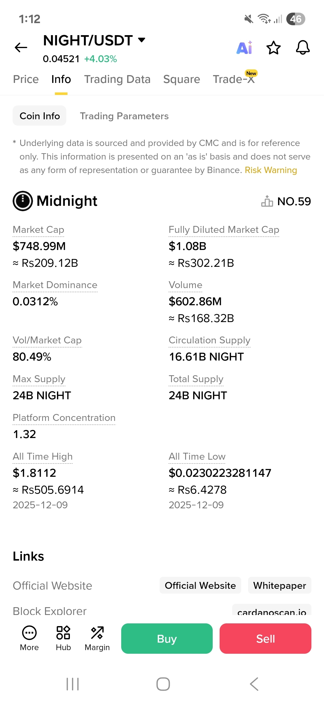 Binance market snapshot today shows price around $0.04521, market cap about $748.99M, FDV about $1.08B, and 24h volume about $602.86M. Circulating supply is about 16.61B NIGHT out of 24B total and max supply.