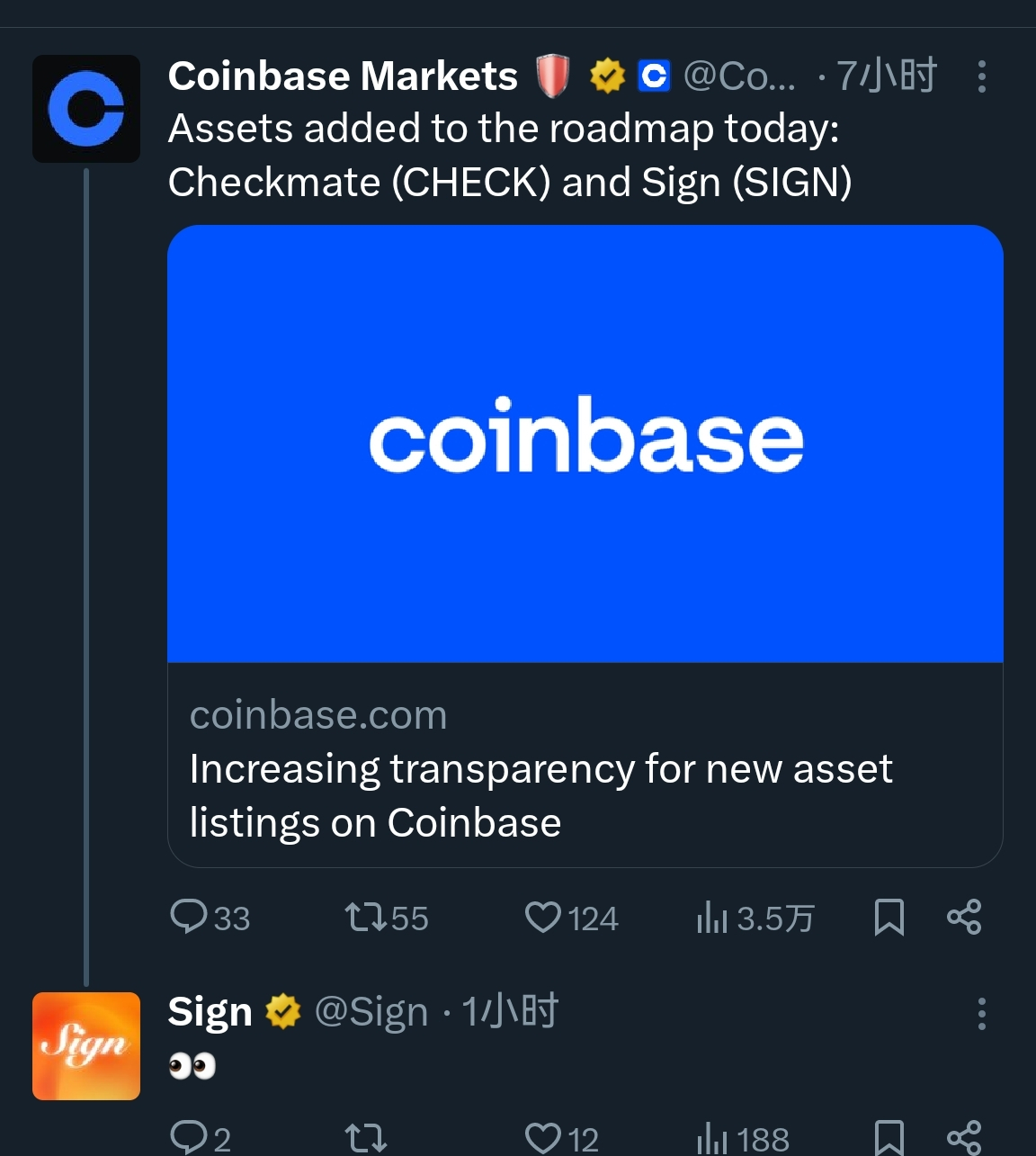 @SignOfficial 3月25号凌晨刷推,看到Coinbase把$SIGN加到了上币路线图。