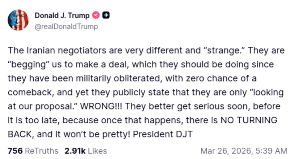 Publicação no Truth Social do presidente Donald Trump. Fonte: Truth Social