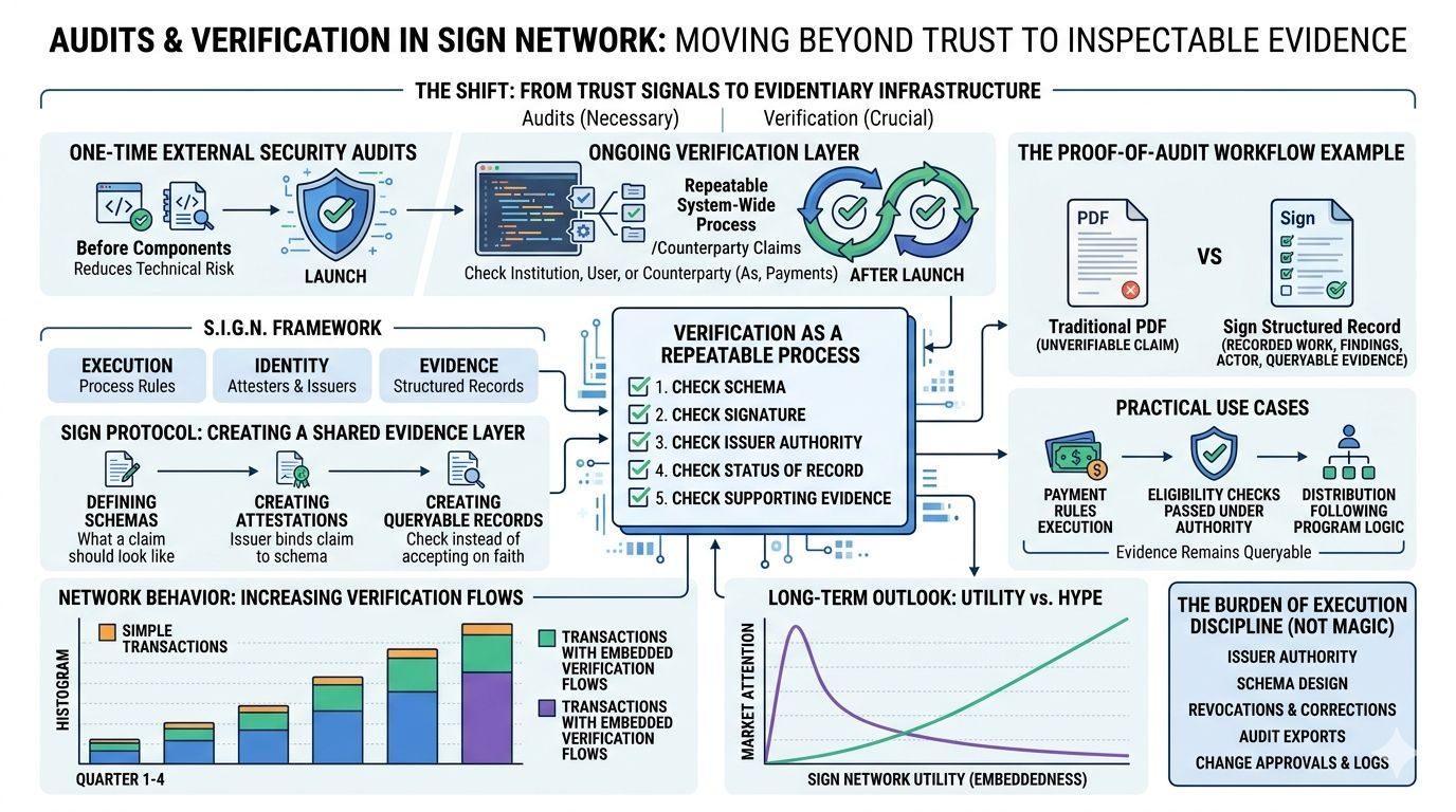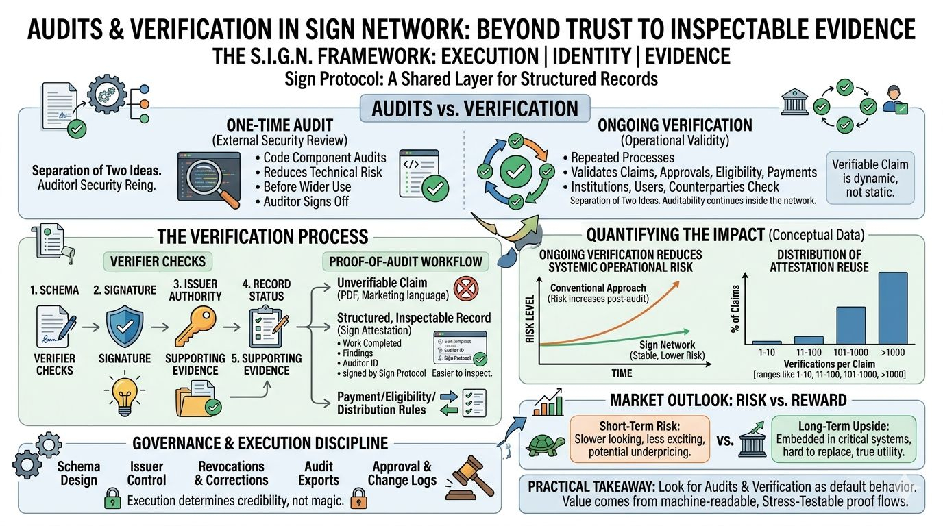 My practical takeaway is simple. If I were judging Sign, I would spend less time chasing attention and more time watching whether audits and verification become default behavior across the network. I would want repeated, machine-readable proof flows for completed audits, eligibility checks, approvals, and distribution records that can still be inspected under stress. The short-term risk is that verification-heavy infrastructure often looks slower and less exciting than consumer-facing products, so the market may underprice it or lose patience early. The long-term upside is clearer to me. If Sign becomes embedded in how claims are recorded, checked, and reconciled across important systems, its value will come from being hard to replace, not easy to hype. That is the sharpest way I know to understand what audits and verification really do in Sign Network.