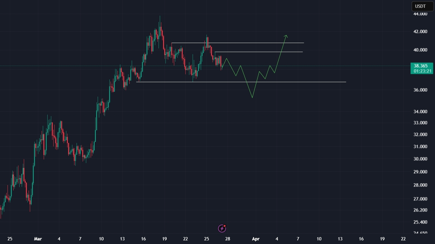 A controlled dip into support followed by a strong reaction would align with the projected upward path. Reclaiming the mid‑range and pushing through 40 would signal that buyers are ready to drive a new leg toward the upper resistance. This scenario depends on volume returning as price lifts from support.