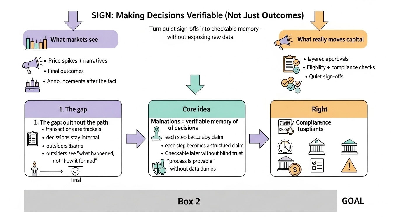 SIGN seems to sit in that space: not replacing existing systems, but adding a layer where decisions leave a verifiable trace. if that becomes normal, people may start paying attention not only to what decisions produce, but to how they formed—because the important part was happening earlier than the market was trained to watch.