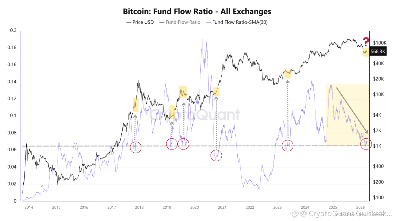 A falling Fund Flow Ratio does not automatically mean bearishness. It can mean that speculative churn is being flushed out, coins are moving less aggressively through exchanges, and the market is transitioning from distribution/noise back into tighter supply and cleaner positioning.