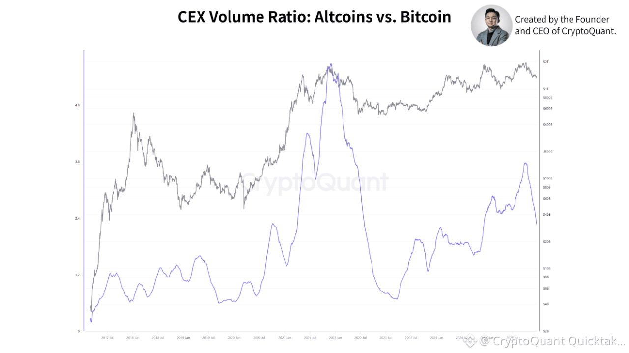 This divergence is evident in the CEX Volume Ratio (Altcoins vs BTC), developed by CryptoQuant CEO Ki Young Ju. The ratio has declined significantly since the 2021 peak, indicating a structural shift in capital preference from altcoins to Bitcoin. This reflects not just outflows, but a broader risk-off positioning across the market.