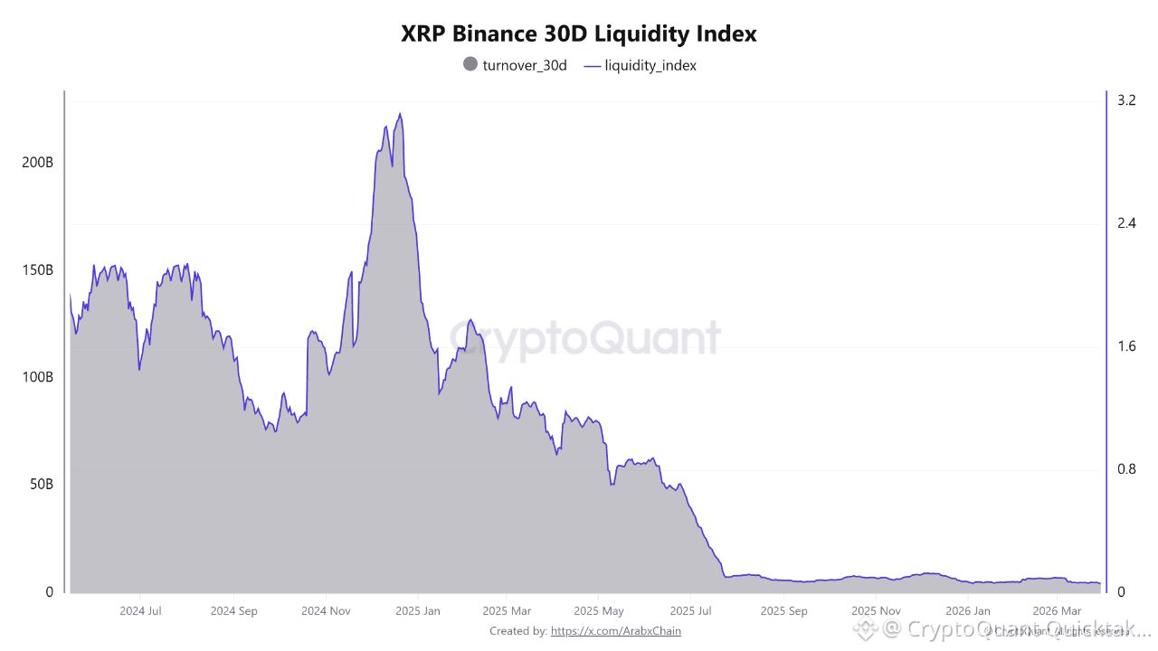 The 30-day liquidity index (30D Liquidity Index) for XRP on Binance indicates a significant decline in market depth, with the index dropping to approximately 0.062, one of its lowest levels in recent periods. This decrease reflects weakening available liquidity within the market, meaning that buy and sell orders are less dense compared to periods of higher liquidity.