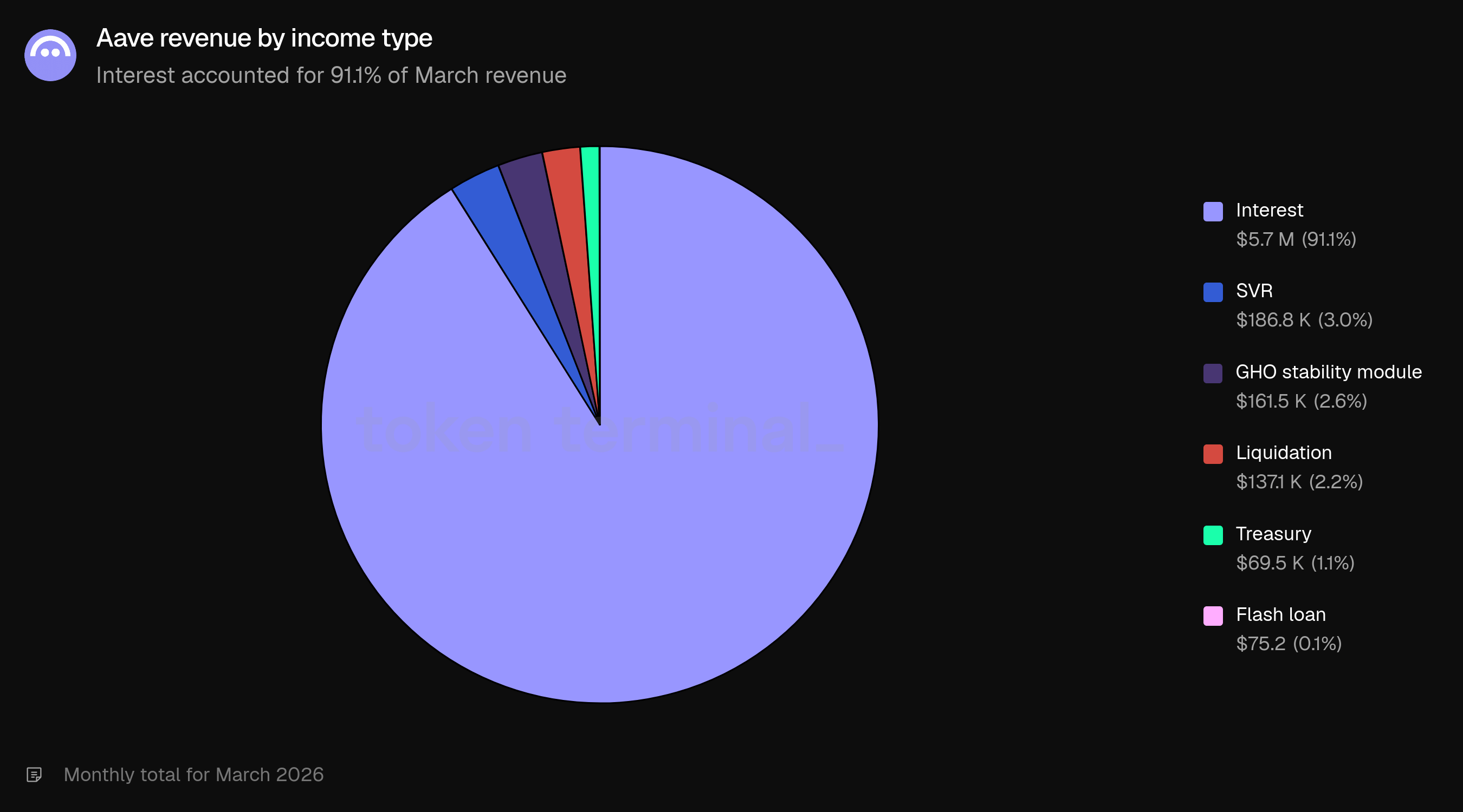 By income type, interest accounted for 91.1% of March revenue ($5.7m), followed by SVR at 3.0% ($186.8k), GHO stability module at 2.6% ($161.5k), liquidation at 2.2% ($137.1k), treasury at 1.1% ($69.5k), and flash loan at 0.1% ($75.2). The income composition returned to a profile dominated by interest income, in contrast to February where nearly half of revenue came from liquidation-related sources.