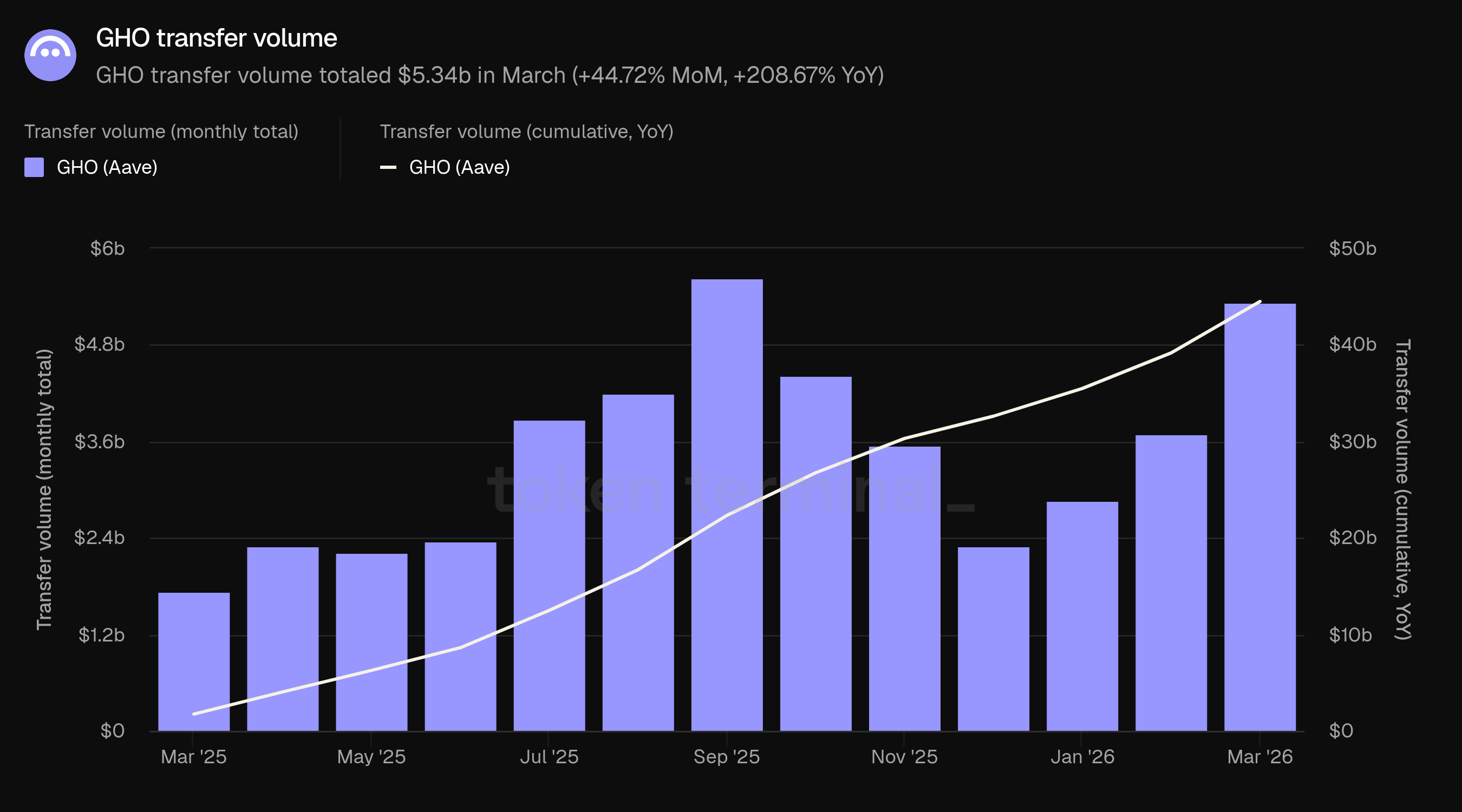 GHO transfer volume measures the total USD value of GHO transferred onchain over a given period. March transfer volume totaled $5.34b, up 44.72% from February's $3.69b and up 208.67% from March 2025's $1.73b. March was the second-highest month on record, approaching the September 2025 peak of $5.63b. Transfer volume declined through late 2025 alongside broader market activity but has rebounded sharply in Q1 2026, with March volume more than doubling year-over-year even as GHO's market cap grew at a slower pace. The divergence between transfer volume growth (+208.67% YoY) and market cap growth (+139.98% YoY) indicates increasing velocity: each unit of GHO is being transacted more frequently.