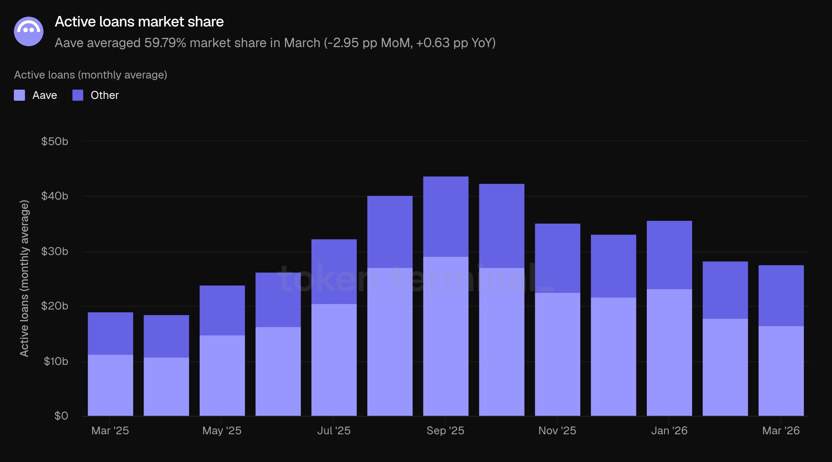 Market share measures Aave's share of active loans relative to other lending projects, including Morpho, Fluid, Kamino, Spark, Maple Finance, Silo Finance, Euler, and Compound. Aave averaged 59.79% market share in March, down 2.95 pp from February and up 0.63 pp from March 2025.