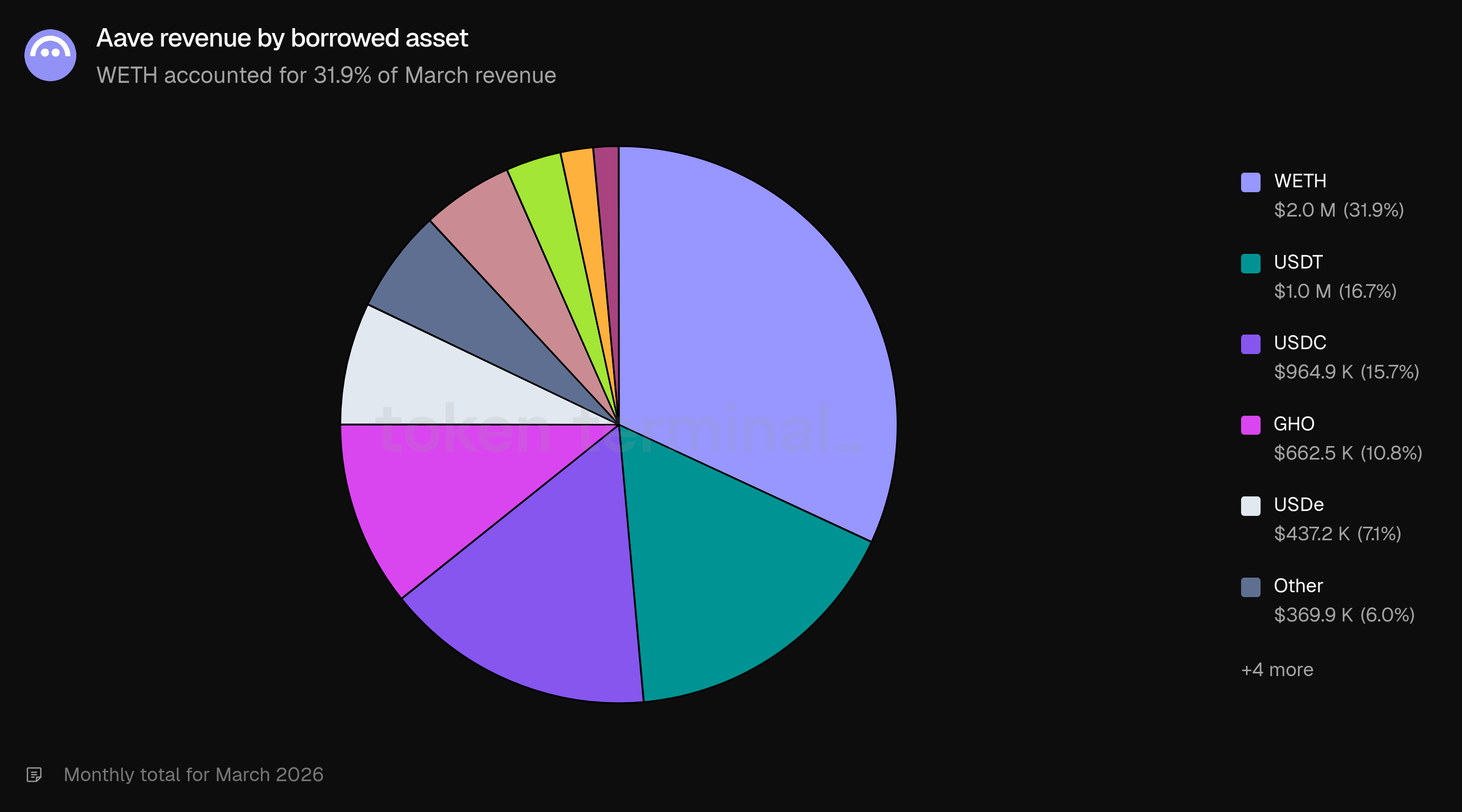 By borrowed asset, WETH accounted for 31.9% of revenue ($2.0m), followed by USDT (16.7%, $1.0m), USDC (15.7%, $964.9k), GHO (10.8%, $662.5k), and USDe (7.1%, $437.2k). GHO's 10.8% share of revenue is notable given its smaller role in the overall lending market, reflecting GHO role as Aave's native stablecoin.