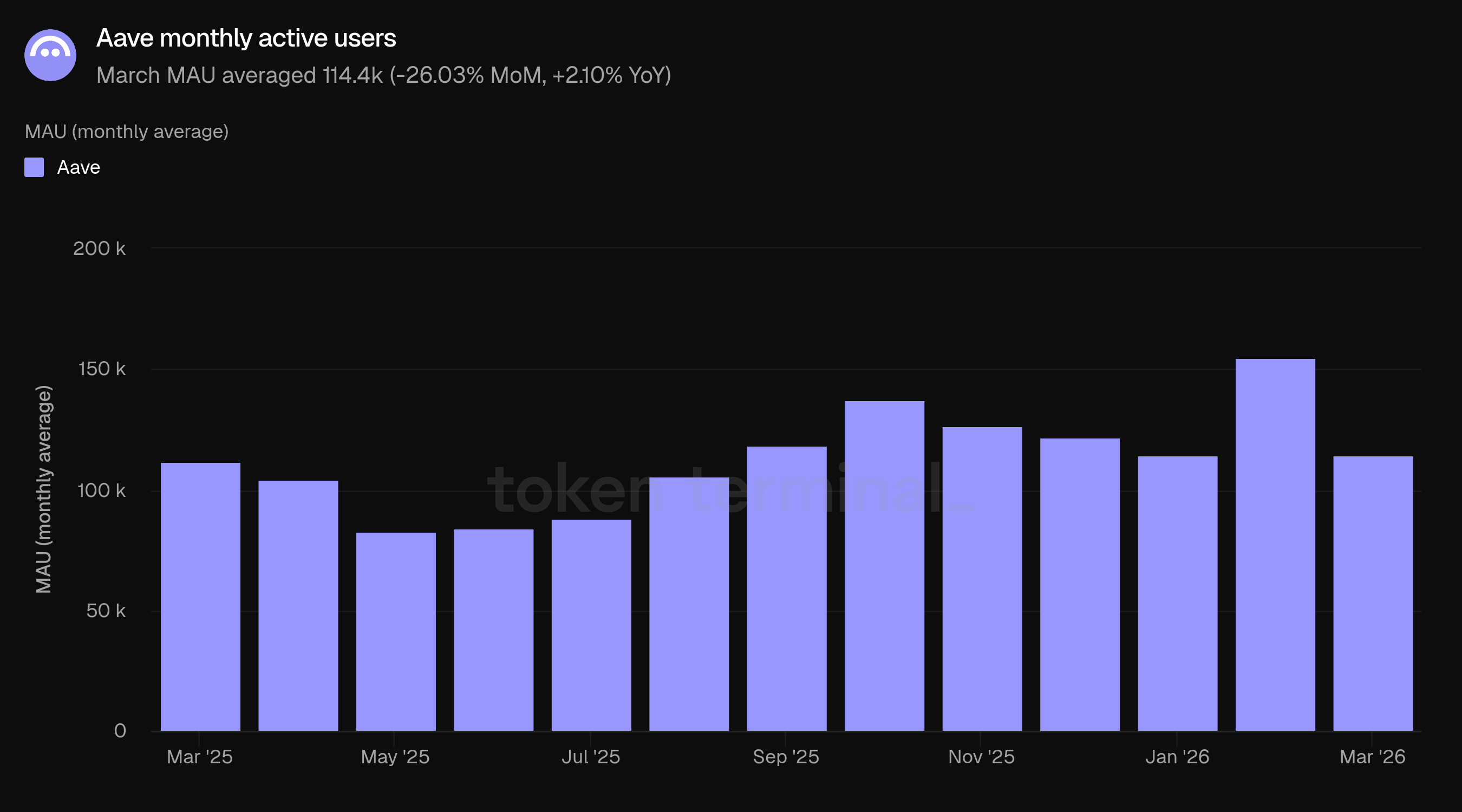 Monthly active users (MAU) measures the number of unique wallet addresses that have interacted with Aave over a rolling 30-day period. March MAU averaged 114.4k, down 26.03% from February's 154.6k but up 2.10% from March 2025's 112.0k.