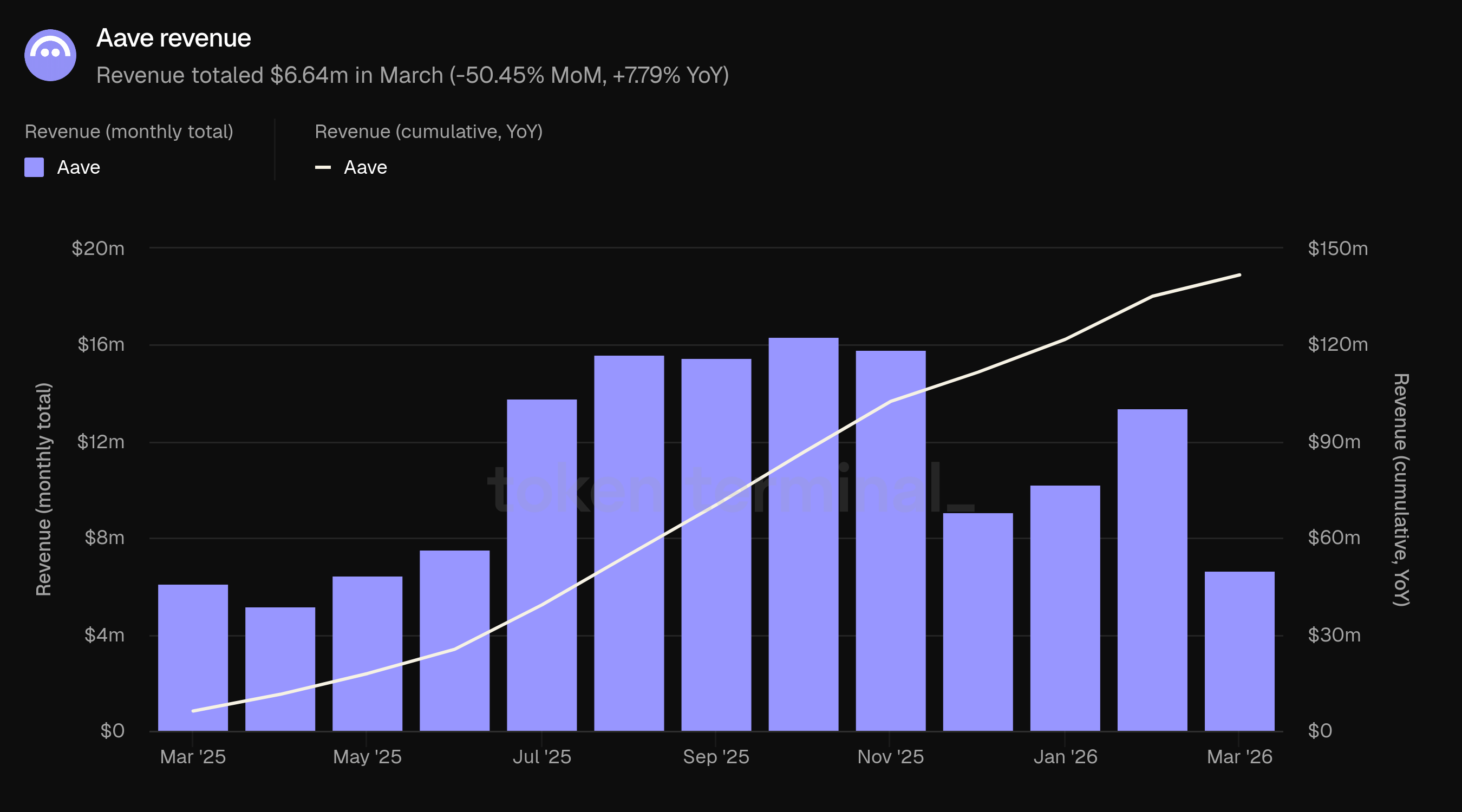 Revenue measures the total USD value of fees retained by the Aave DAO. March revenue totaled $6.64m, down 50.45% from February's $13.40m but up 7.79% from March 2025's $6.16m. Cumulative revenue from March 2025 to March 2026 reached $141.79m.