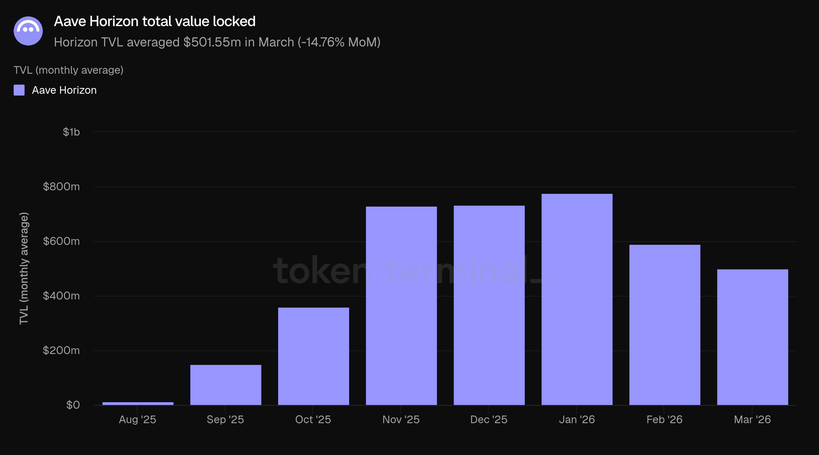 Horizon total value locked measures the total USD value of collateral deposited into Aave Horizon and outstanding loans. March Horizon TVL averaged $501.55m, down 14.76% from February's $588.40m. Horizon TVL peaked at $775.95m in January 2026 and has declined over the past two months. Horizon grew rapidly from its August 2025 launch ($14.30m) through January, a trajectory that coincided with the broader expansion in tokenized asset activity onchain.