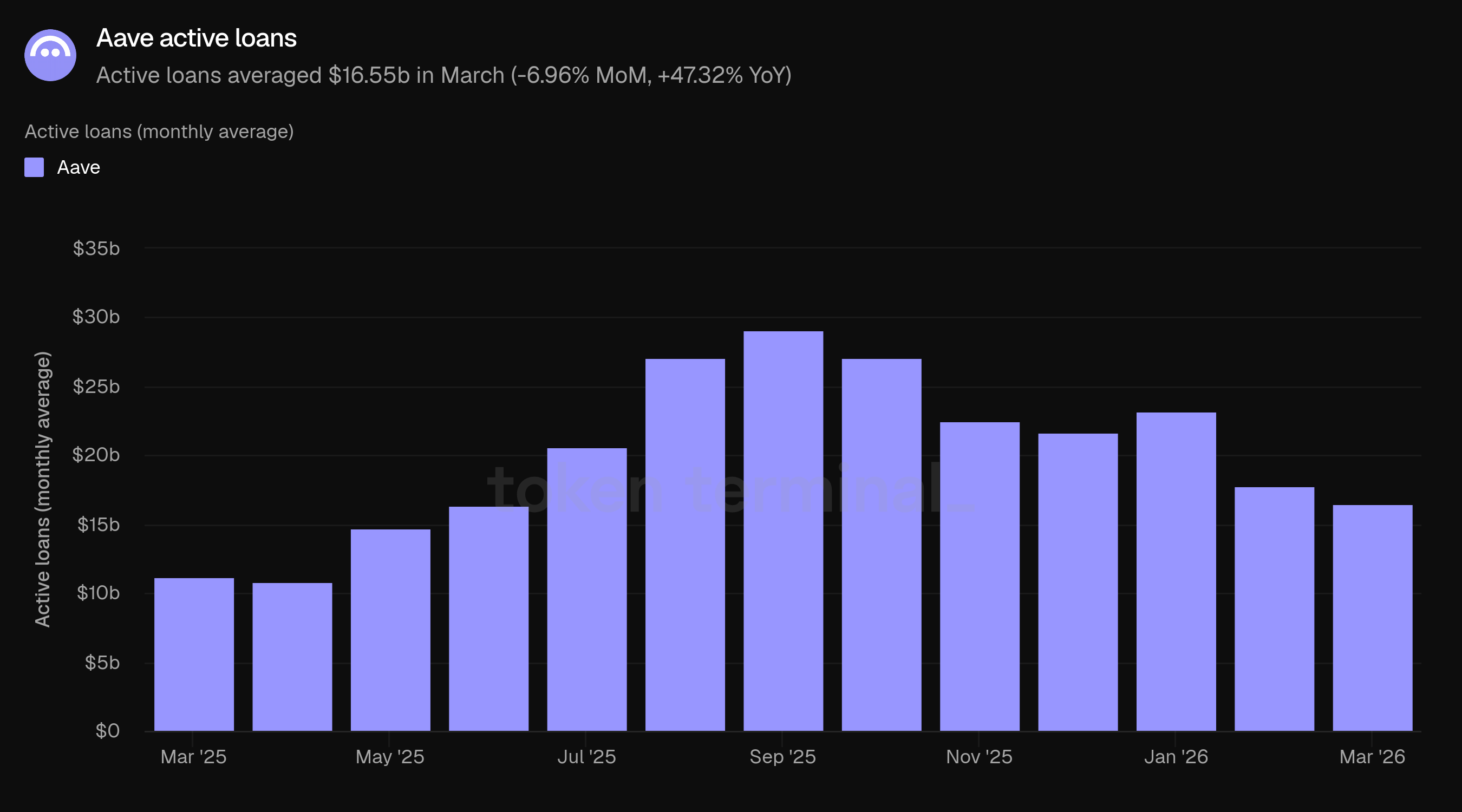 Active loans measures the total USD value of outstanding borrows across all Aave lending markets. March active loans averaged $16.55b, down 6.96% from February's $17.79b but up 47.32% from March 2025's $11.24b.