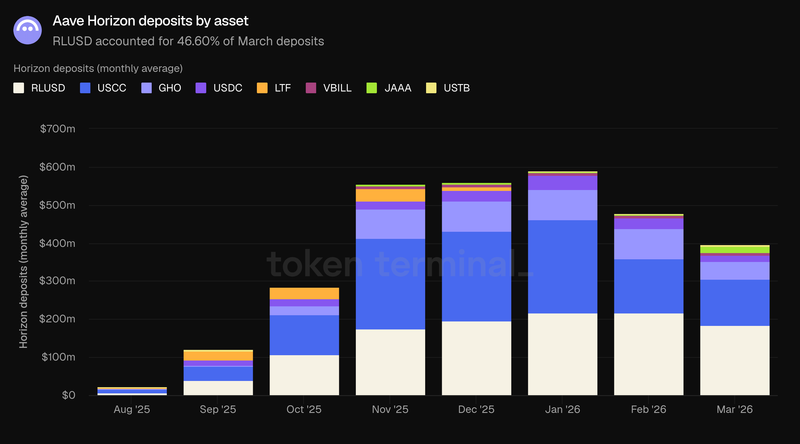 Horizon deposits measures the total USD value of assets supplied to Horizon's markets. March deposits averaged $395.50m, down 17.13% from February's $477.24m. Deposits comprise two types: permissionless stablecoin supply (RLUSD, GHO, USDC) and permissioned RWA collateral deposited by institutional investors through tokenization issuers (USCC, JAAA, VBILL).