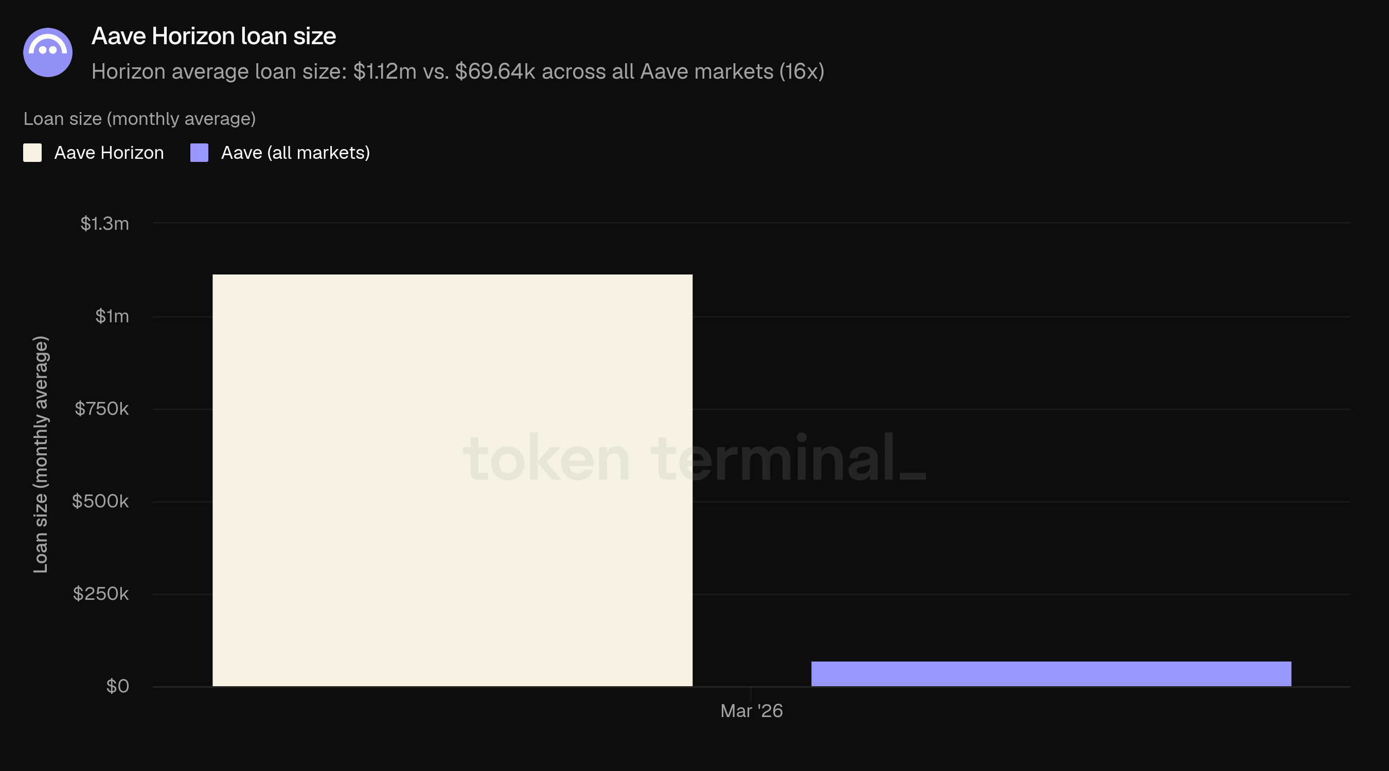 Loan size measures the average USD value of outstanding borrows per borrower. In March, the average Horizon loan was $1.118m, compared to $69.641k across all Aave markets, a 16x difference. This is consistent with Horizon's role as a venue for institutional-scale borrowing against permissioned collateral, in contrast to the retail and DeFi-native activity that characterizes the core lending markets.
