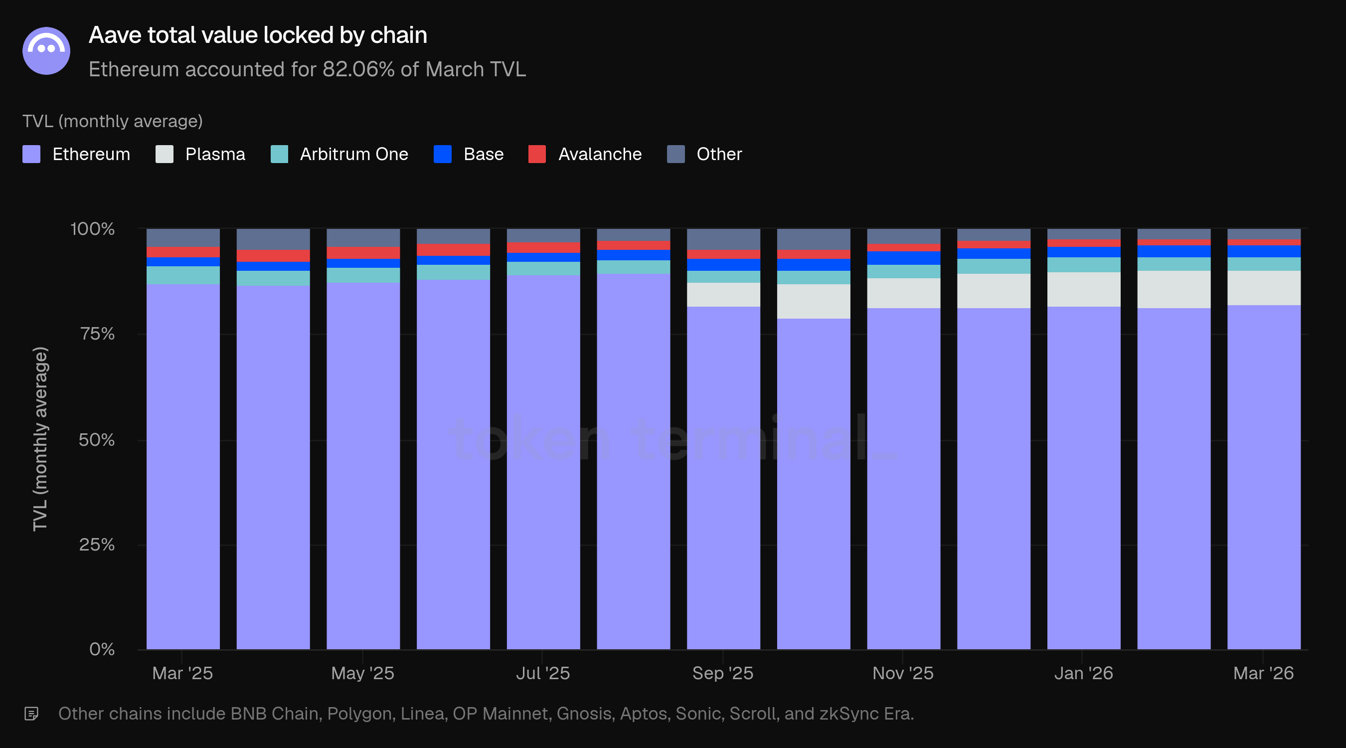 Compared to March 2025, the chain distribution has diversified. Ethereum's share has declined from 87.30% to 82.06%, with Plasma, Base, and other deployments absorbing the difference. This reflects Aave's multichain strategy, though Ethereum remains the overwhelming center of gravity for capital.