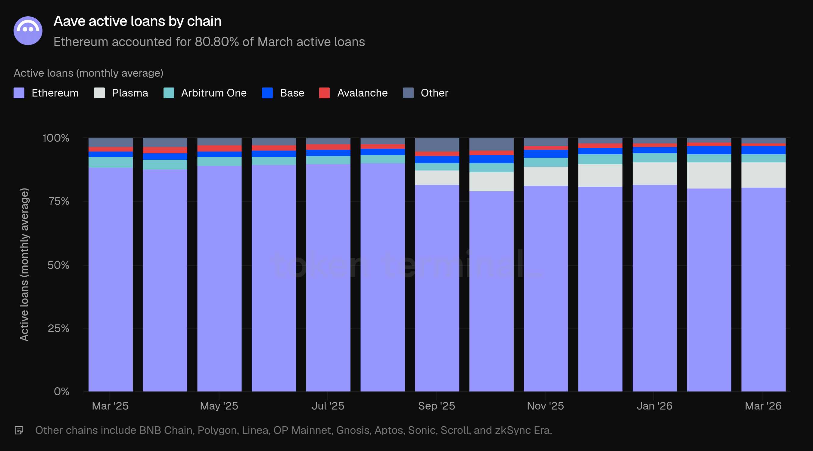 The chain distribution closely mirrored TVL. Ethereum accounted for 80.80% of March active loans, with Plasma at 9.98%, Base at 3.12%, Arbitrum One at 3.11%, Avalanche at 1.38%, and other chains at 1.62%. Plasma's active loan share declined slightly from 10.28% in February, while Ethereum held steady.