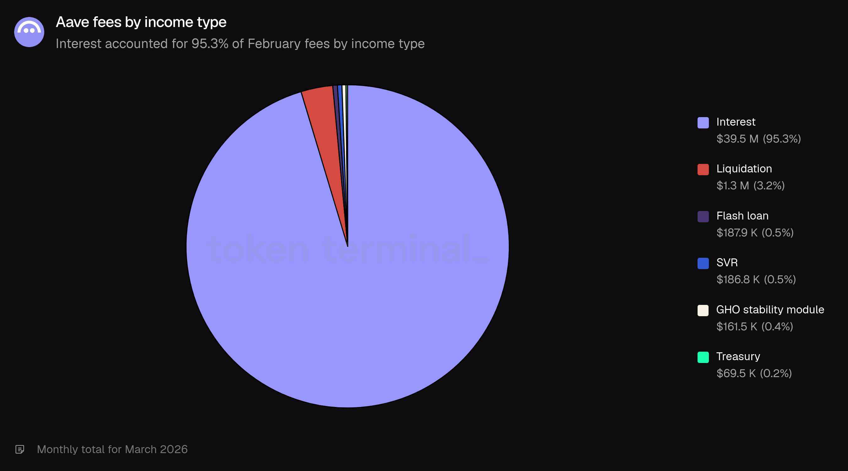 By income type, interest dominated at 95.3% ($39.5m), followed by liquidation at 3.2% ($1.3m), flash loan at 0.5% ($187.9k), SVR at 0.5% ($186.8k), GHO stability module at 0.4% ($161.5k), and treasury at 0.2% ($69.5k). The shift from February's 68.0% interest / 25.1% liquidation / 6.2% SVR split to March's 95.3% interest represents the full normalization of fee composition following the market correction.