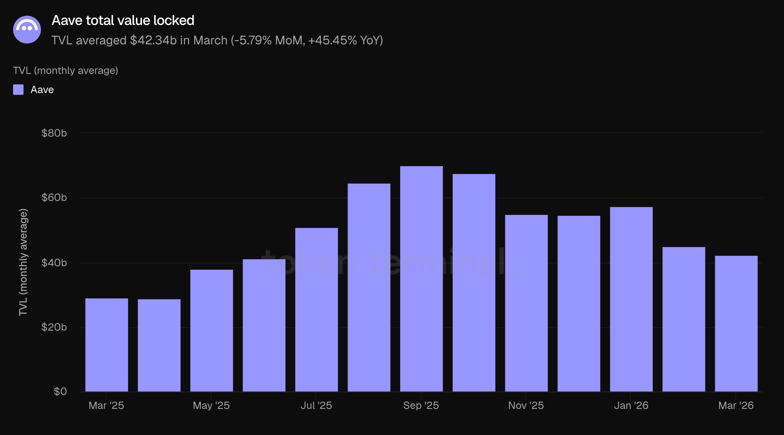 Total value locked (TVL) measures the total USD value of collateral deposited into Aave and outstanding loans. March TVL averaged $42.34b, down 5.79% from February's $44.94b but up 45.45% from March 2025's $29.11b.