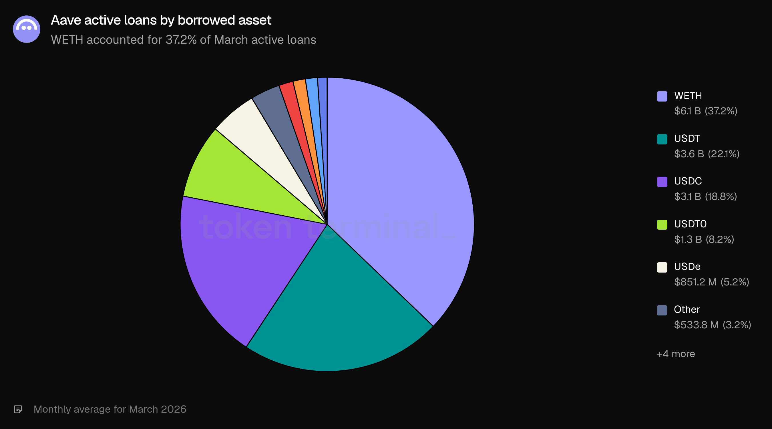 Borrows remained concentrated in a few assets. WETH led at 37.2% of active loans, followed by USDT (22.1%), USDC (18.8%), USDT0 (8.2%), and USDe (5.2%). The top three borrowed assets accounted for 78.1% of all outstanding loans. GHO appeared at 1.1% of active loans, representing borrowers minting Aave's native stablecoin against their collateral. The borrow composition was broadly stable from February, with WETH's share increasing modestly from 36.4%.
