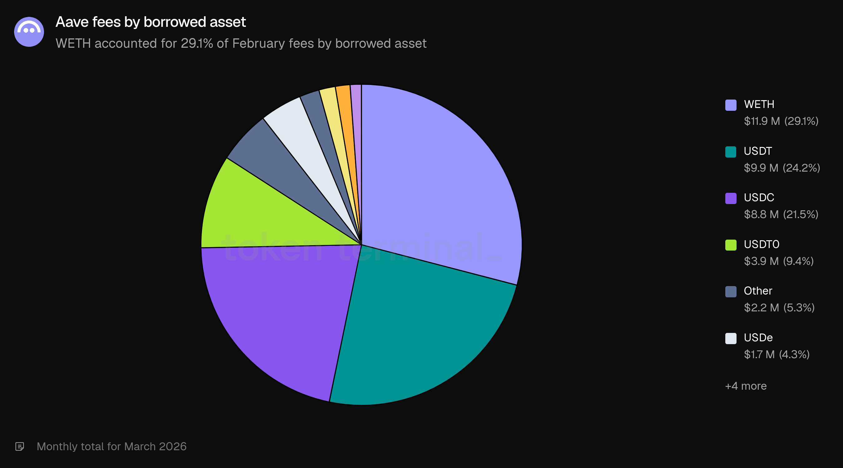 By borrowed asset, WETH accounted for 29.1% of fees, followed by USDT (24.2%), USDC (21.5%), USDT0 (9.4%), and other assets (5.3%). Stablecoin borrowing (USDT, USDC, USDT0) collectively generated 55.1% of fees.