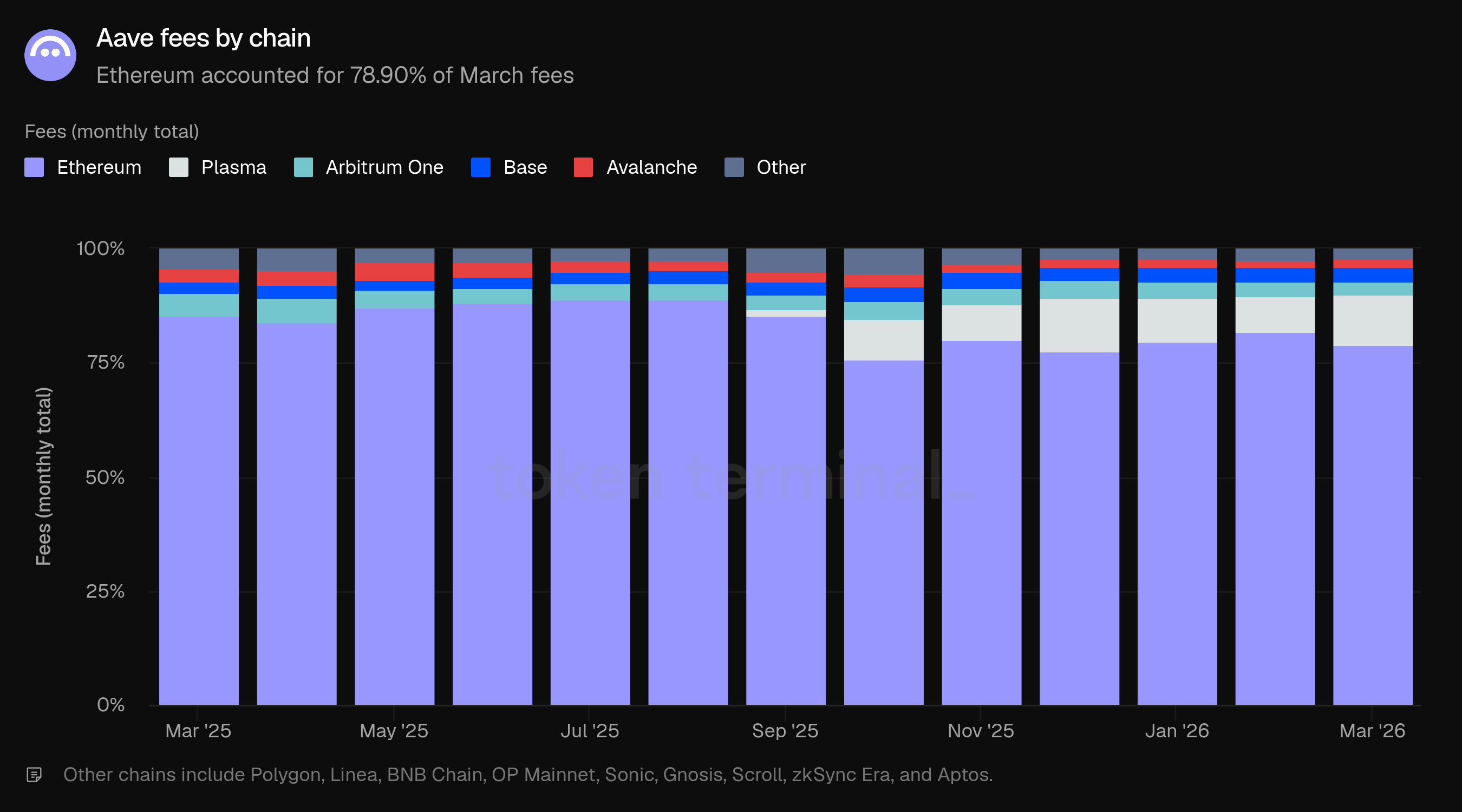 Ethereum accounted for 78.90% of March fees, down from 81.95% in February. February's liquidation and SVR activity was concentrated on Ethereum, where the largest positions reside. As those income sources receded in March, Ethereum's fee share moved closer to its TVL share (82.06%).