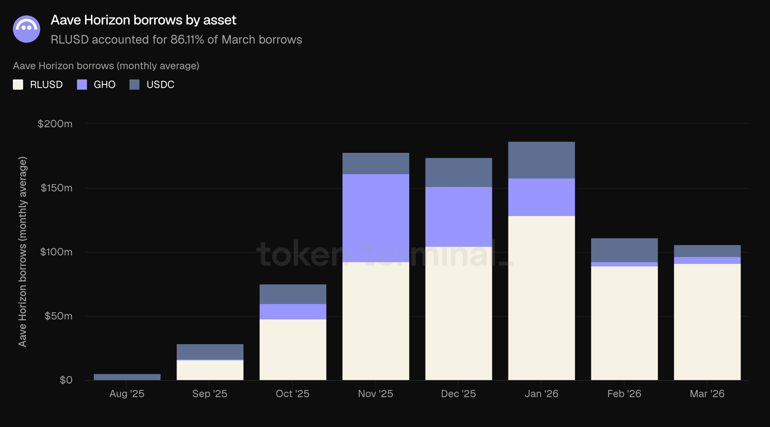 Horizon borrows measures the total USD value of stablecoins borrowed against collateral in Horizon's markets. March borrows averaged $106.05m, down 4.60% from February's $111.15m. Three stablecoins are available to borrow: RLUSD ($91.43m, 86.22%), USDC ($9.56m, 9.01%), and GHO ($5.06m, 4.77%). Borrows peaked at $186.64m in January 2026.