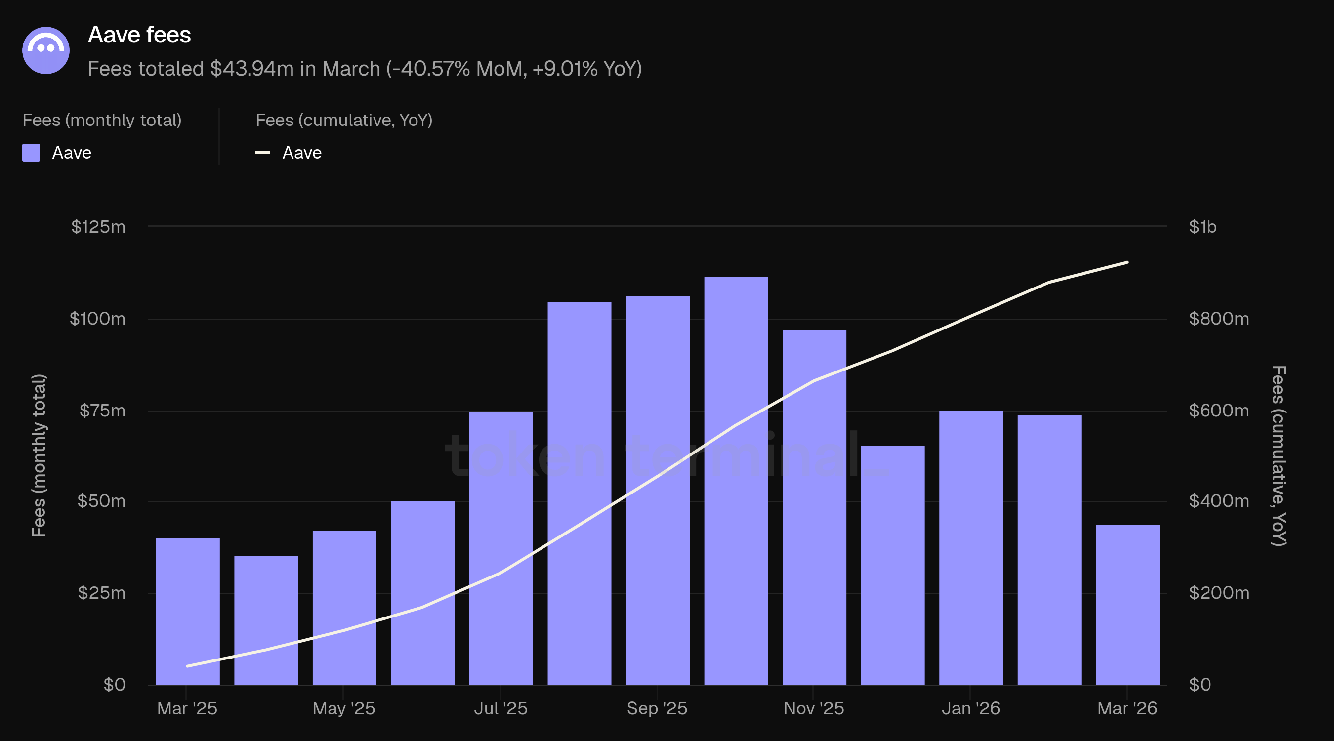 Fees measure the total USD value of fees paid by users across all of Aave's lending markets, aggregated across six income types: interest, liquidation, SVR, flash loan, treasury, and GHO stability module (see Definitions). March fees totaled $43.94m, down 40.57% from February's $73.94m but up 9.01% from March 2025's $40.31m. Cumulative fees from March 2025 to March 2026 reached $922.57m.