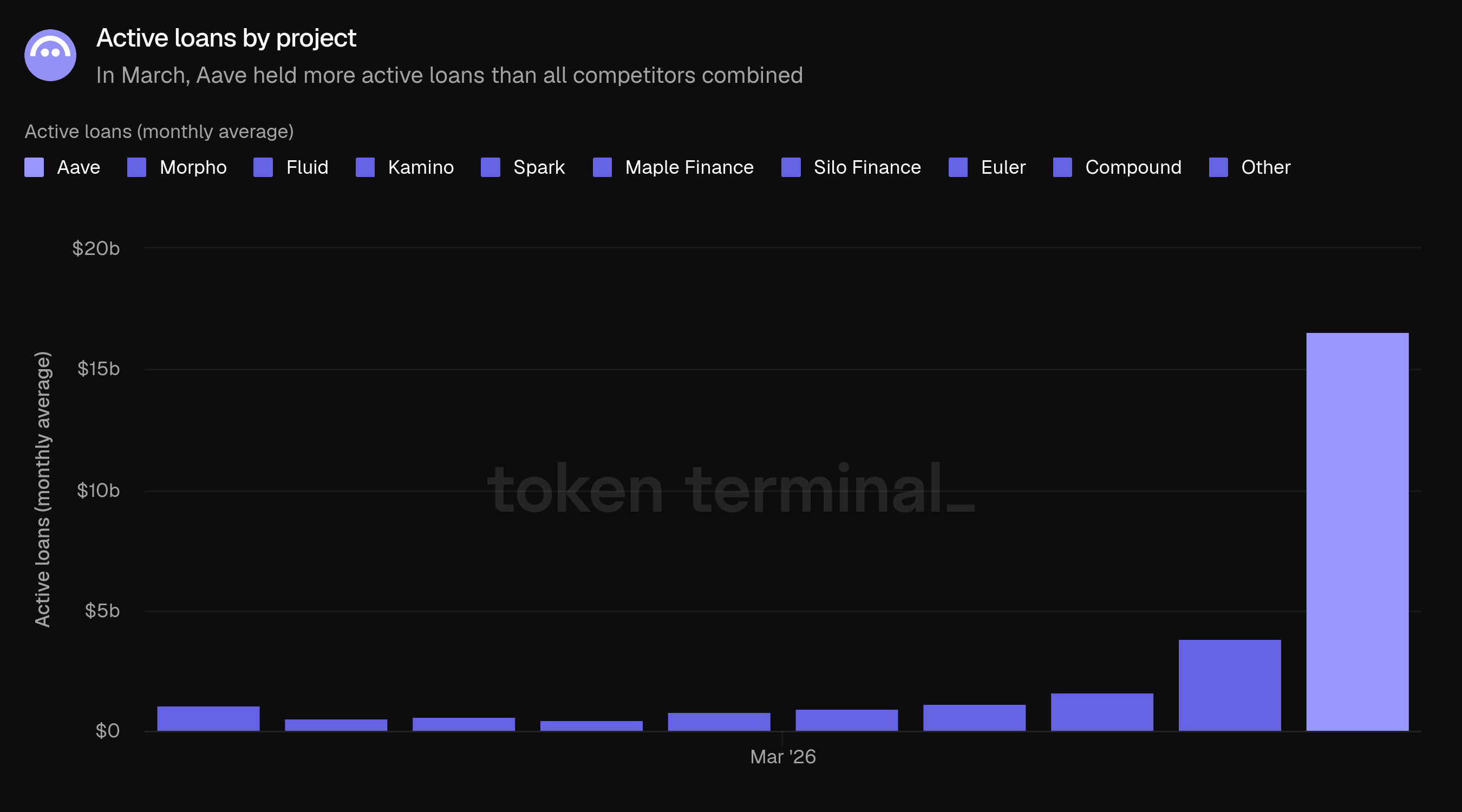 The project ended March with over $42b in deposits across 14 chain deployments, with Ethereum accounting for over 80% of capital. Market share stabilized at approximately 60% of all DeFi lending activity, with Aave holding more active loans than all other tracked competitors combined.