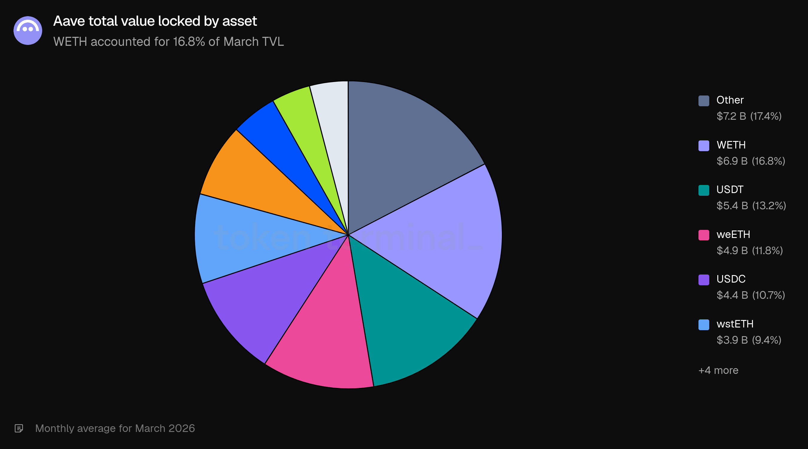 The asset composition was diversified, with WETH leading at 16.8%, followed by USDT (13.2%), weETH (11.8%), USDC (10.7%), and wstETH. Wrapped BTC variants (WBTC and cbBTC) combined for approximately 12.0%. Stablecoins including USDT, USDC, USDT0, and USDe collectively accounted for over 33% of TVL, reflecting Aave's dual role as both a leveraged exposure venue and a stablecoin yield market.